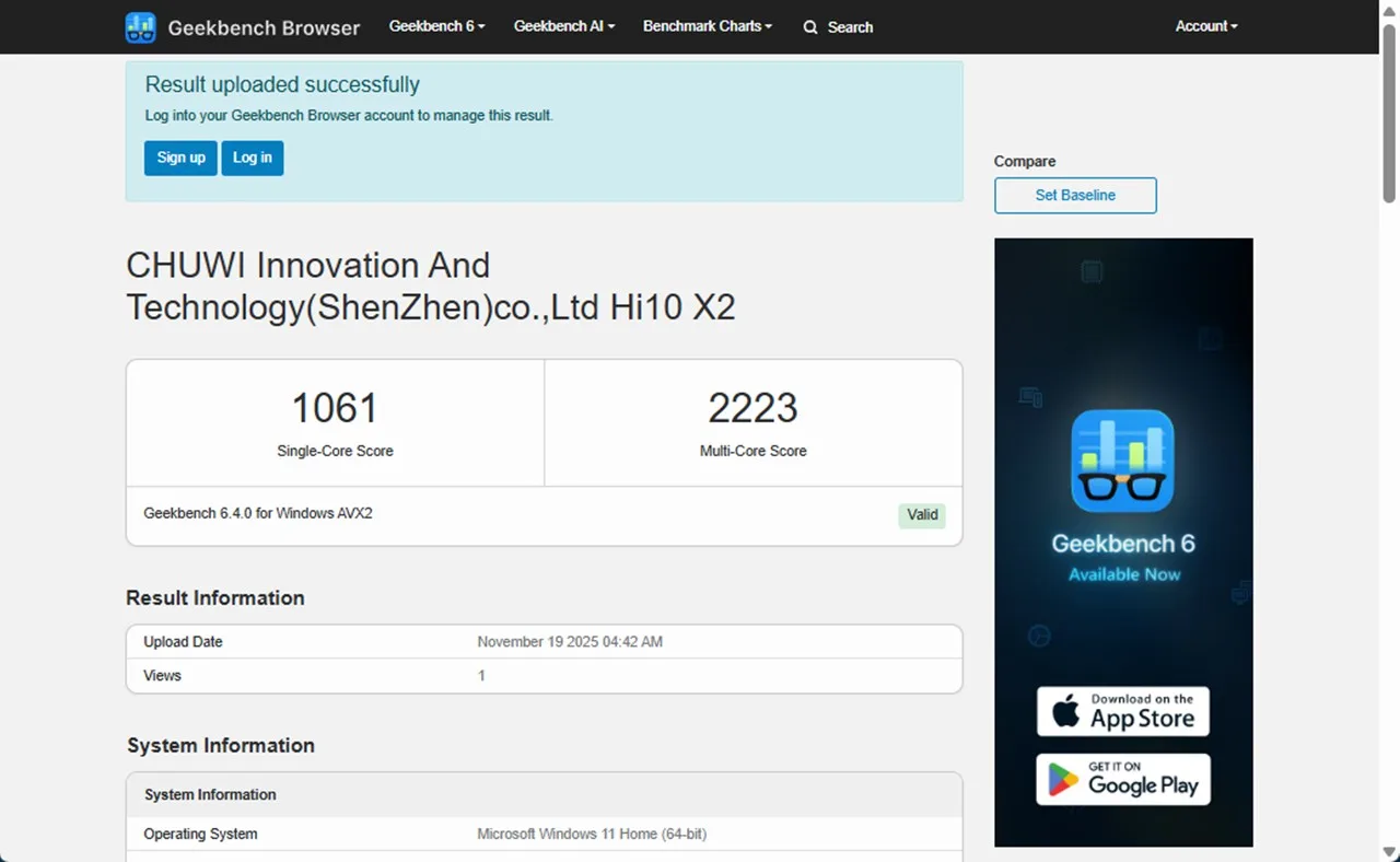 このプロセッサをgeekbench 6ベンチマークを試してみました。