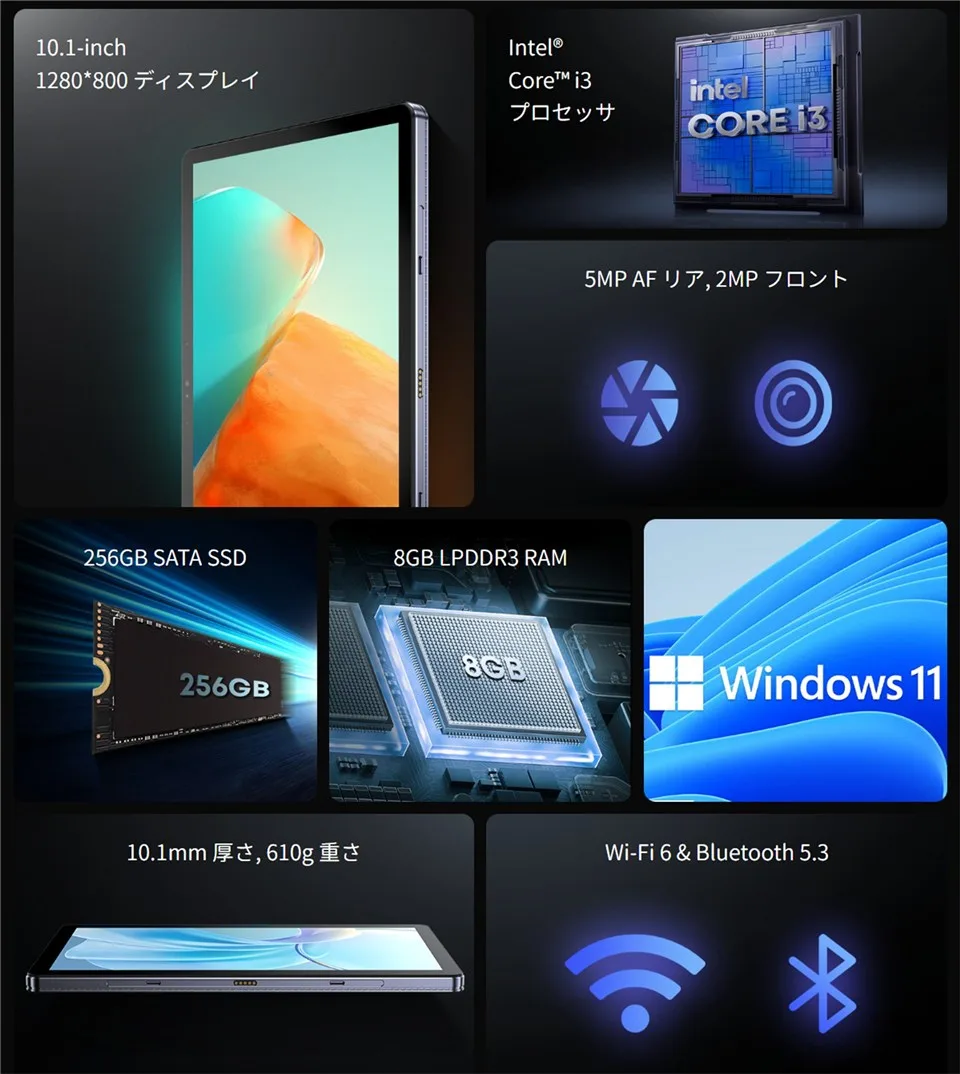 | ディスプレイ | 10.1インチ IPS液晶 解像度:1280 × 800 (HD) アスペクト比:16:10 |