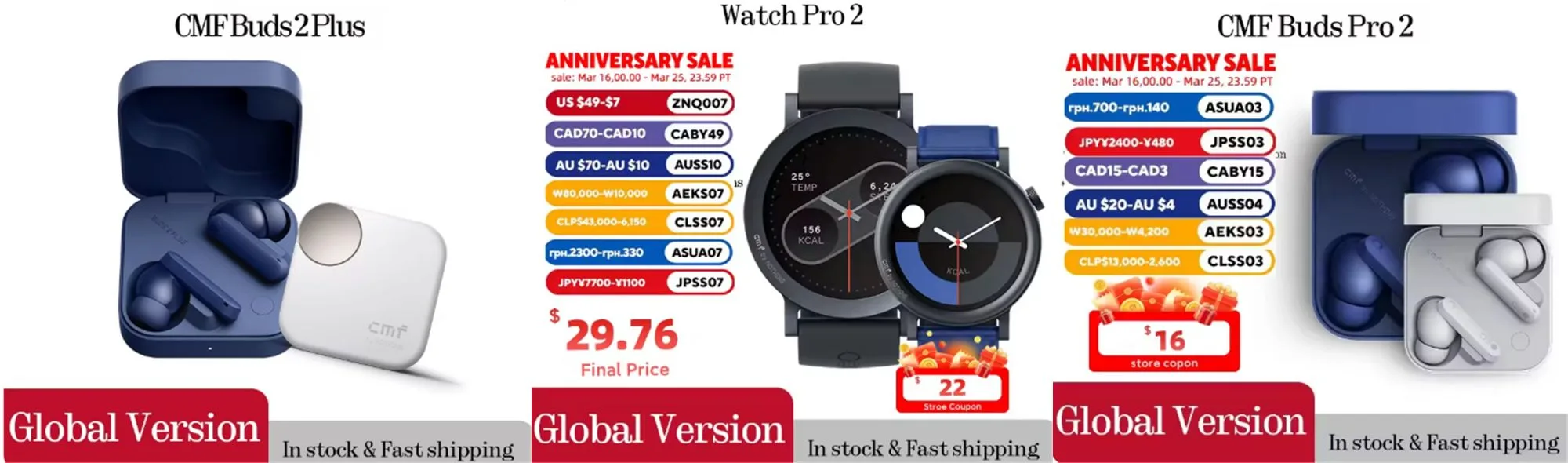 型落ちで半額以下まで値引きされているCMF Watch Pro2スマートウォッチ、CMF Budsシリーズイヤホンがクーポンで大幅値引きセールとなっていますので、まとめてみました。