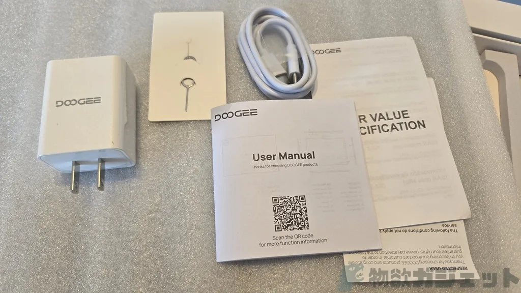 同梱物はマニュアルとUSB Type-Cケーブル、充電器、SIM/microSDカードトレイ取り出しピンがあります。