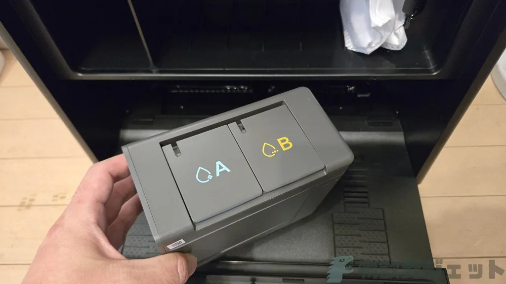 この洗剤入れはA/Bと別れていて、Aの青が床用洗剤、Bの黄色がペット用消臭剤入れとなっています。これらは添付されているものを利用する必要があります。