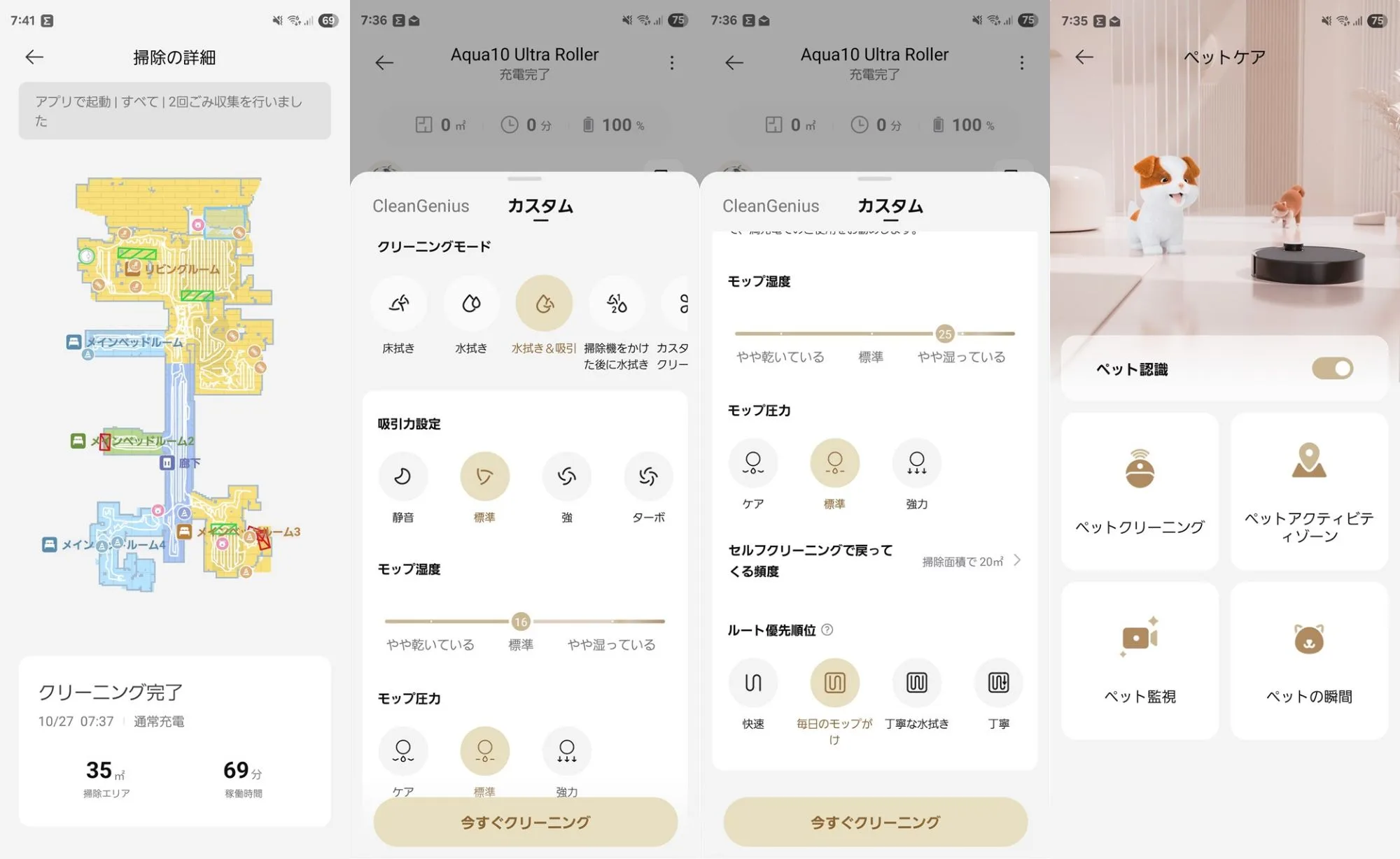 アプリをインストールすると、床拭き時の水量、掃除モードの吸引力、禁止エリアの指定、掃除のスケジュール/タイマー等々の細やかな設定ができるようになります。