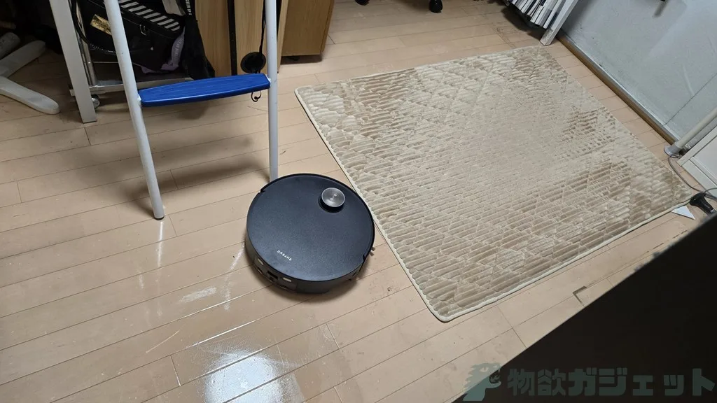 前にあるセンサーでカーペットを認識して即座に切り換えているのではなく、カーペットの範囲と位置をしっかりと計測してから「ここはカーペット」「ここは水拭き」と分けてやっているので、とても効率的です。