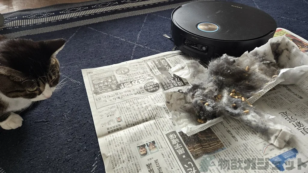 ちょっともったいないですが、紙パックを開けて確認してもみましたが、6日間の掃除分ですが、どっさり取れています。猫トイレの周りには必ず猫砂の粒があるのですが、それも端まで清掃してくれるおかげでしっかりと取れています。