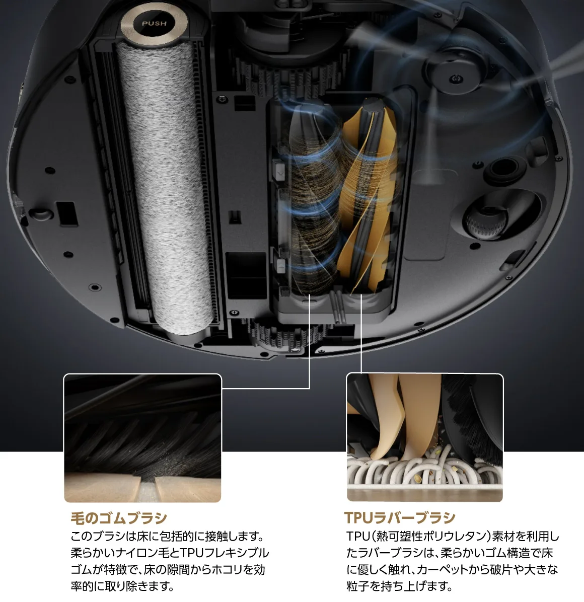 壁際や椅子の足などの際も、ローラーと回転ブラシがせり出して掃除してくれる機能も搭載。