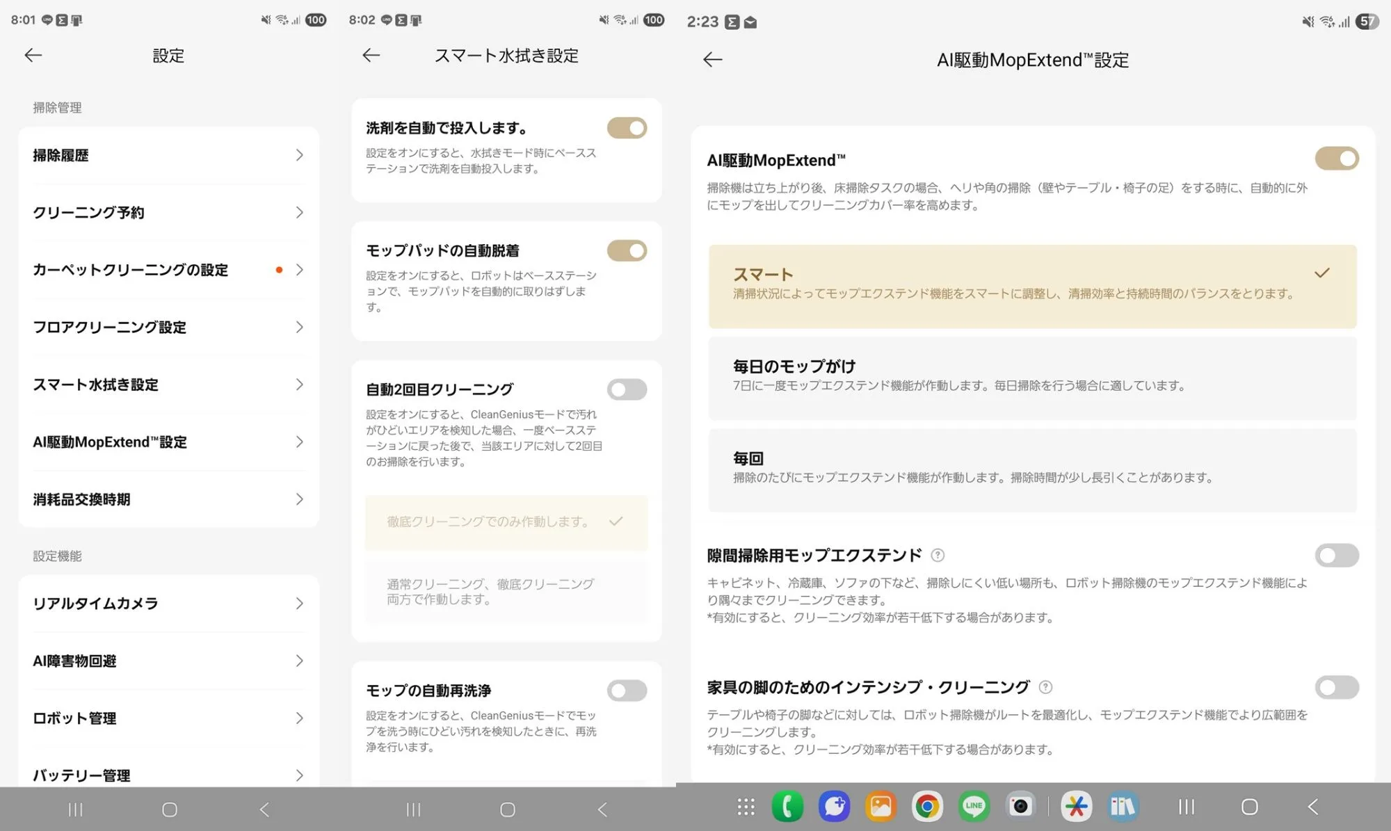 そして、カーペットを避けたり、カーペットで吸引力を変えたり、床板の方向に沿ってクリーニングなども可能です。また、モップエクステンド(回転モップを壁際にせり出して掃除するか)も設定できるなど、とにかく細かく設定できる。