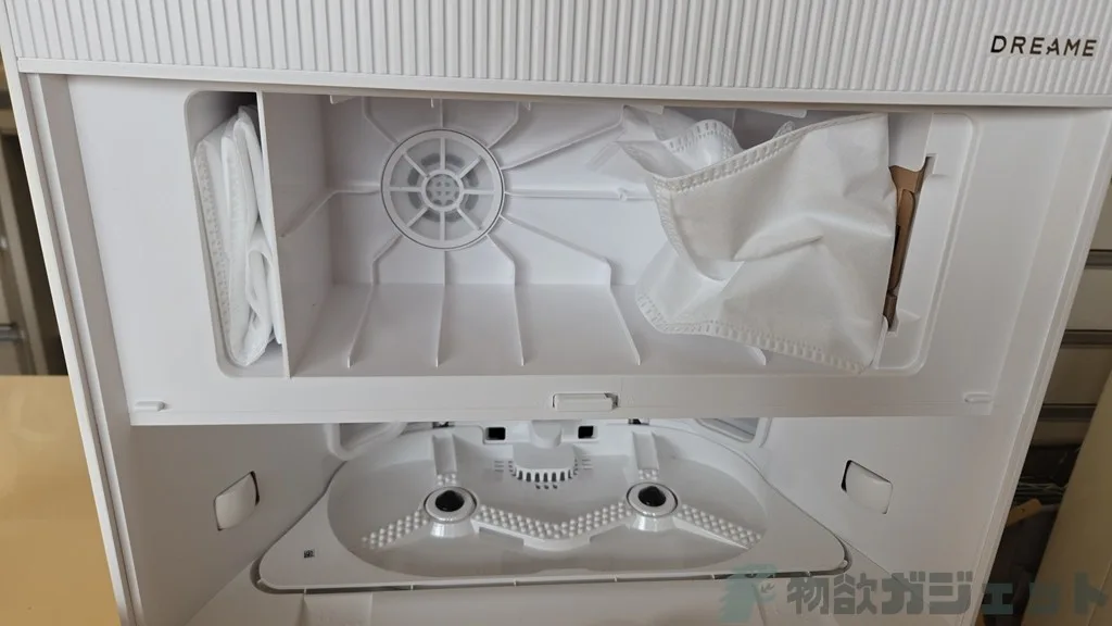 ベースステーションは真ん中にゴミを回収するダストタンクがあります。デフォルトで1つ紙パックが付いており、左側にも予備が1つ収納されていますね。
