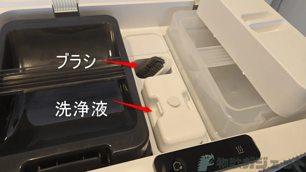 ベースステーションには上部に水拭き用の浄水タンクと汚水タンクがあり、真ん中のスペースにブラシと洗浄液が入るスペースがあります。こちらに付属の洗浄液を入れることで、床がより綺麗になります。