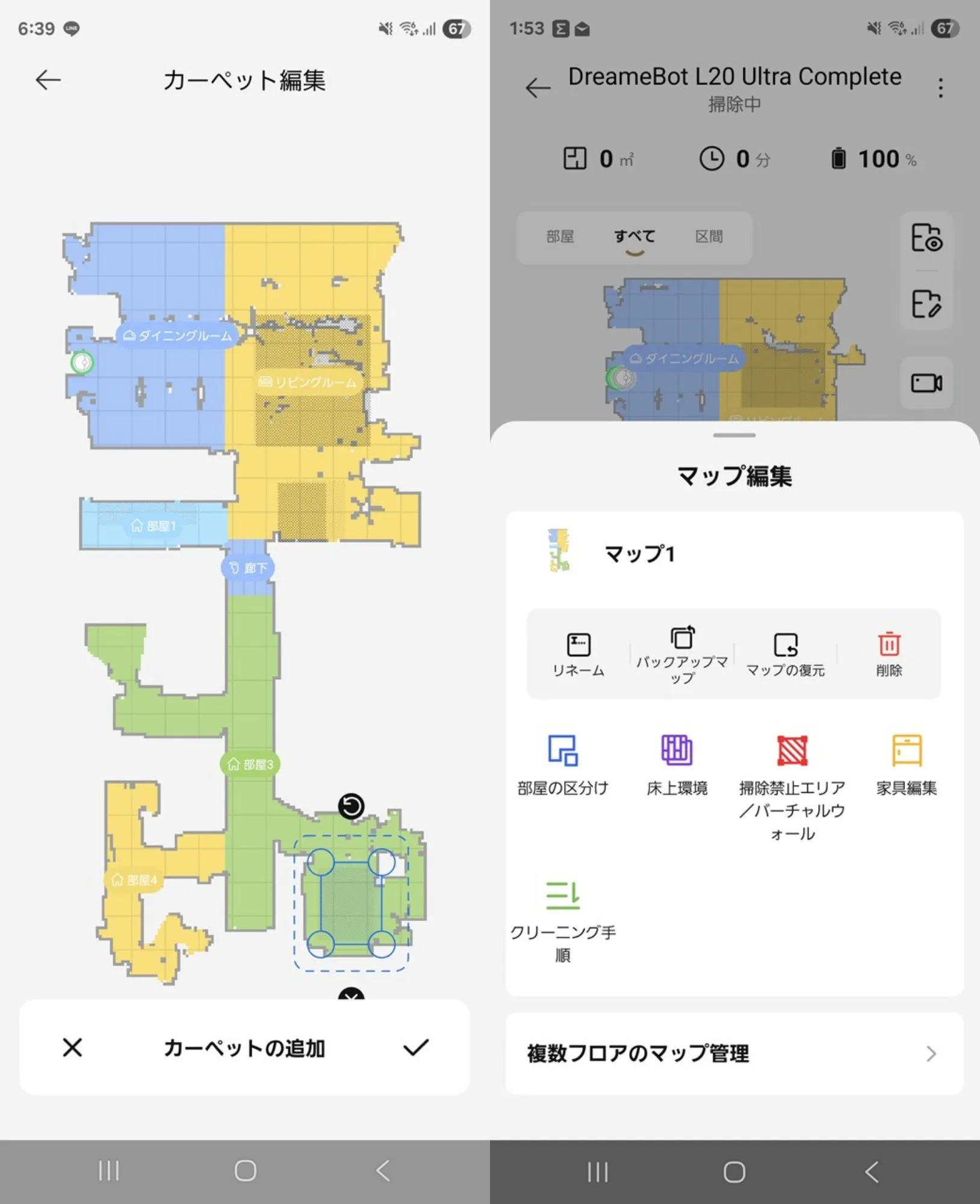 またアプリでカーペットの場所の指定や、モップ掛けと掃除の進入禁止と、かなり細かく指定できます。