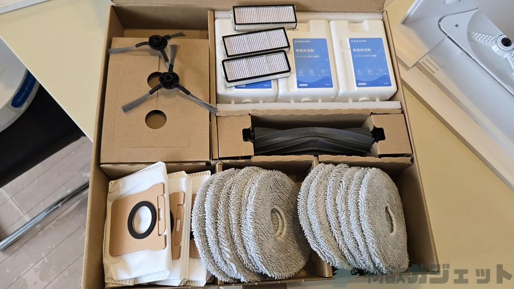 同梱物はデフォルトではベースステーション、電源ケーブル、回転モップパッドx2、マニュアル、紙パック(予備)、床洗剤です。
