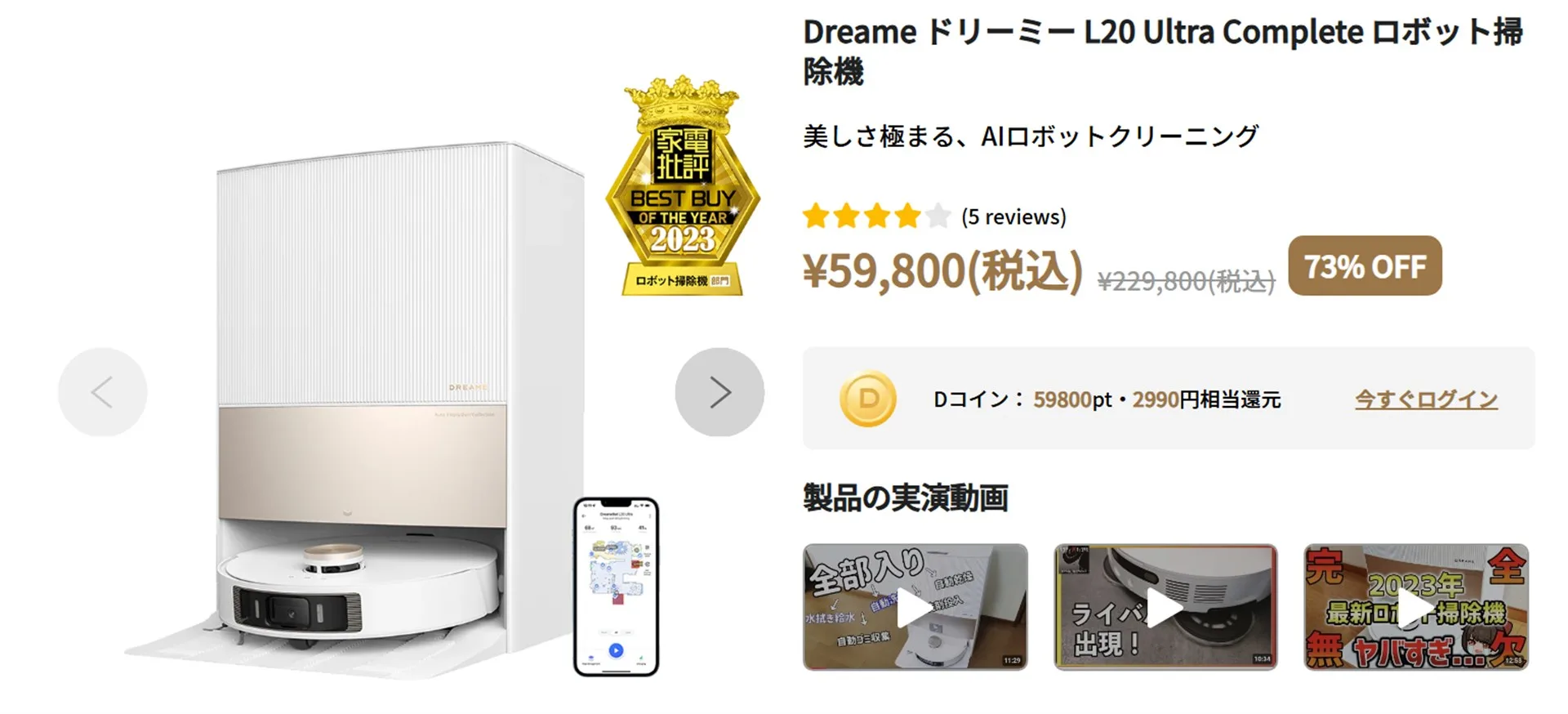 Dreame L20 Ultra Completeは、定価229,800円ですが、実売5万円台という価格となっています。そう考えるとハイエンド機の機能を網羅した「コスパ最強」の全自動ロボット掃除機です。