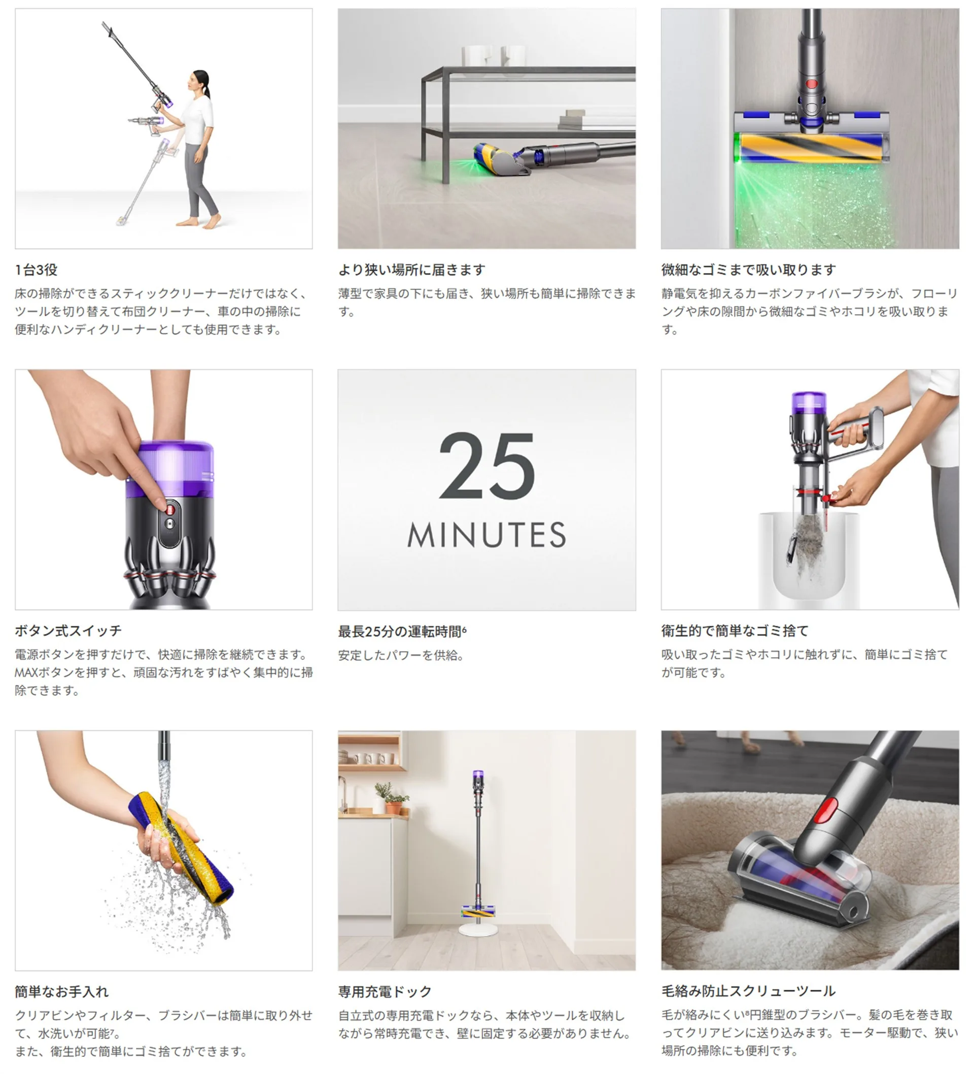 Dyson Micro Plus (SV33 FF PL)は、日本の住宅環境に特化して設計された、最軽量(約1.54kg)でコンパクトなコードレススティッククリーナーです。