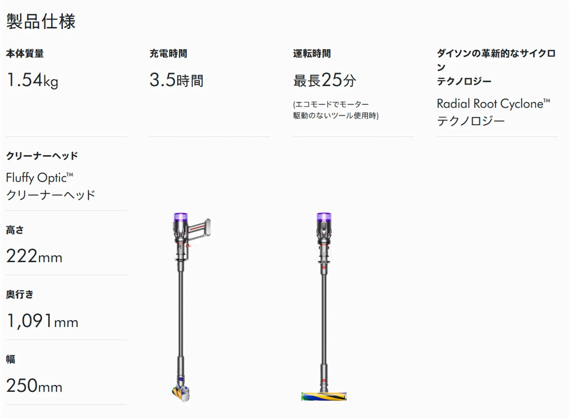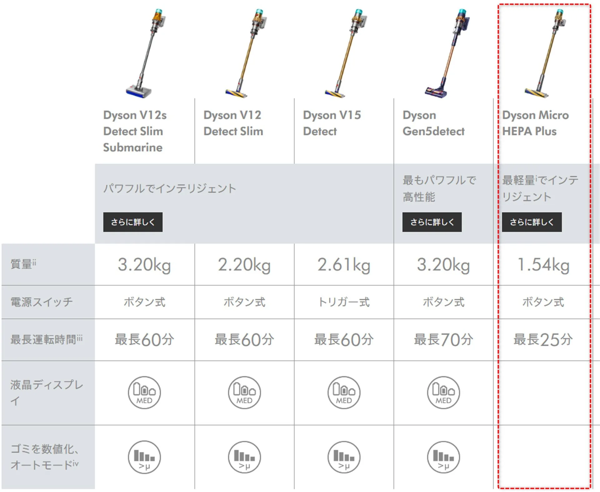 他のダイソンモデルと比較しても、驚異的に軽い事が分かります。