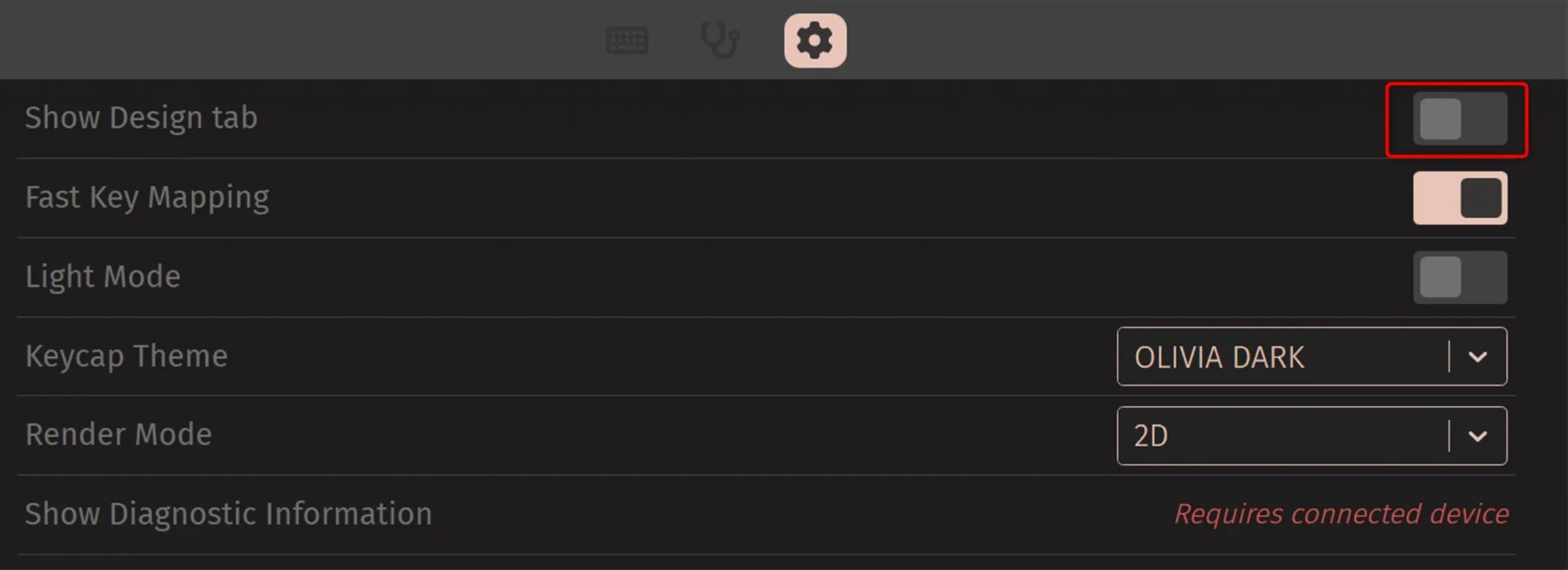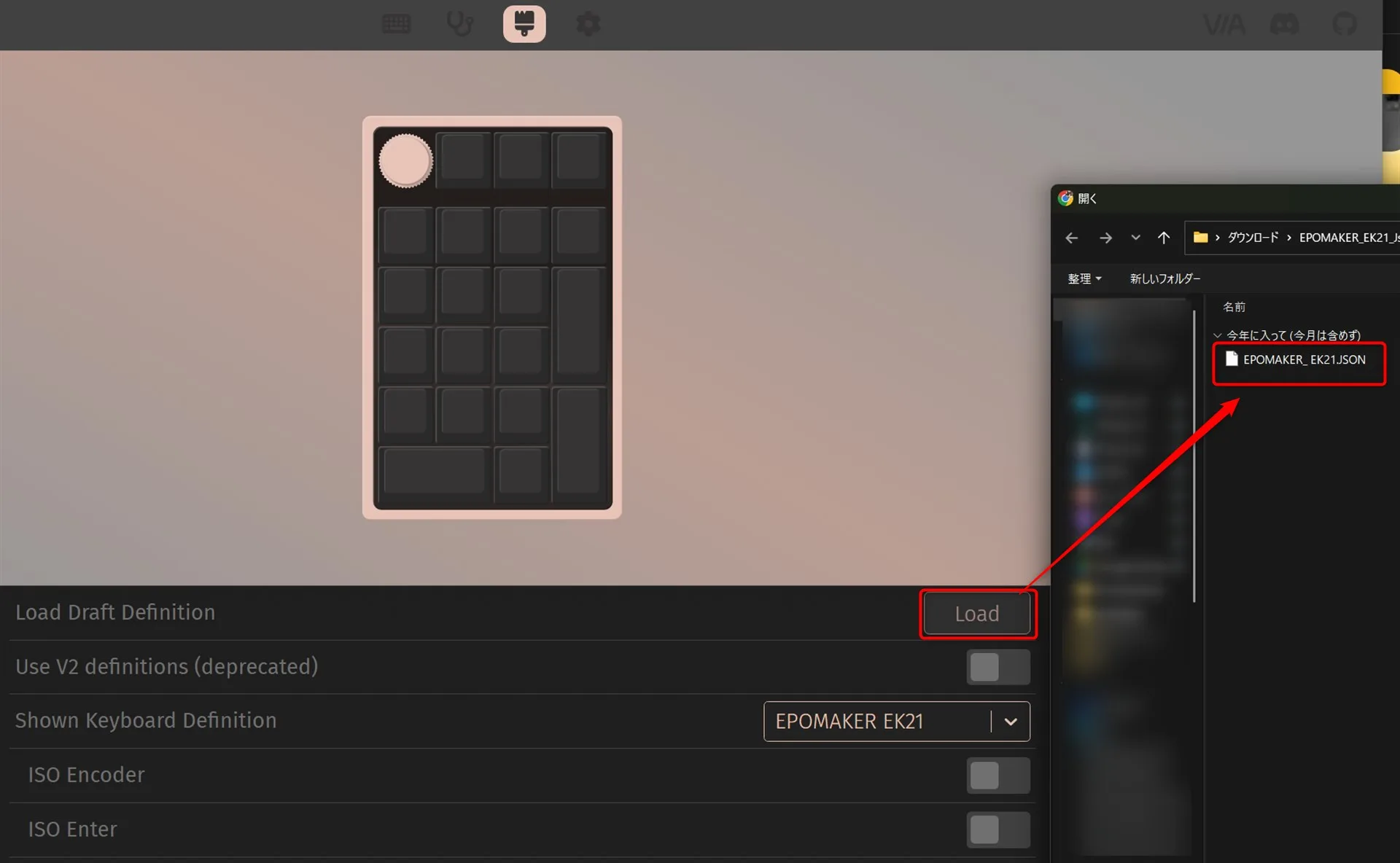 キーボードをPCに有線で接続し、ChromeブラウザからVIAにアクセス。上部の設定タブにある「Show Design Tab」を有効にします。