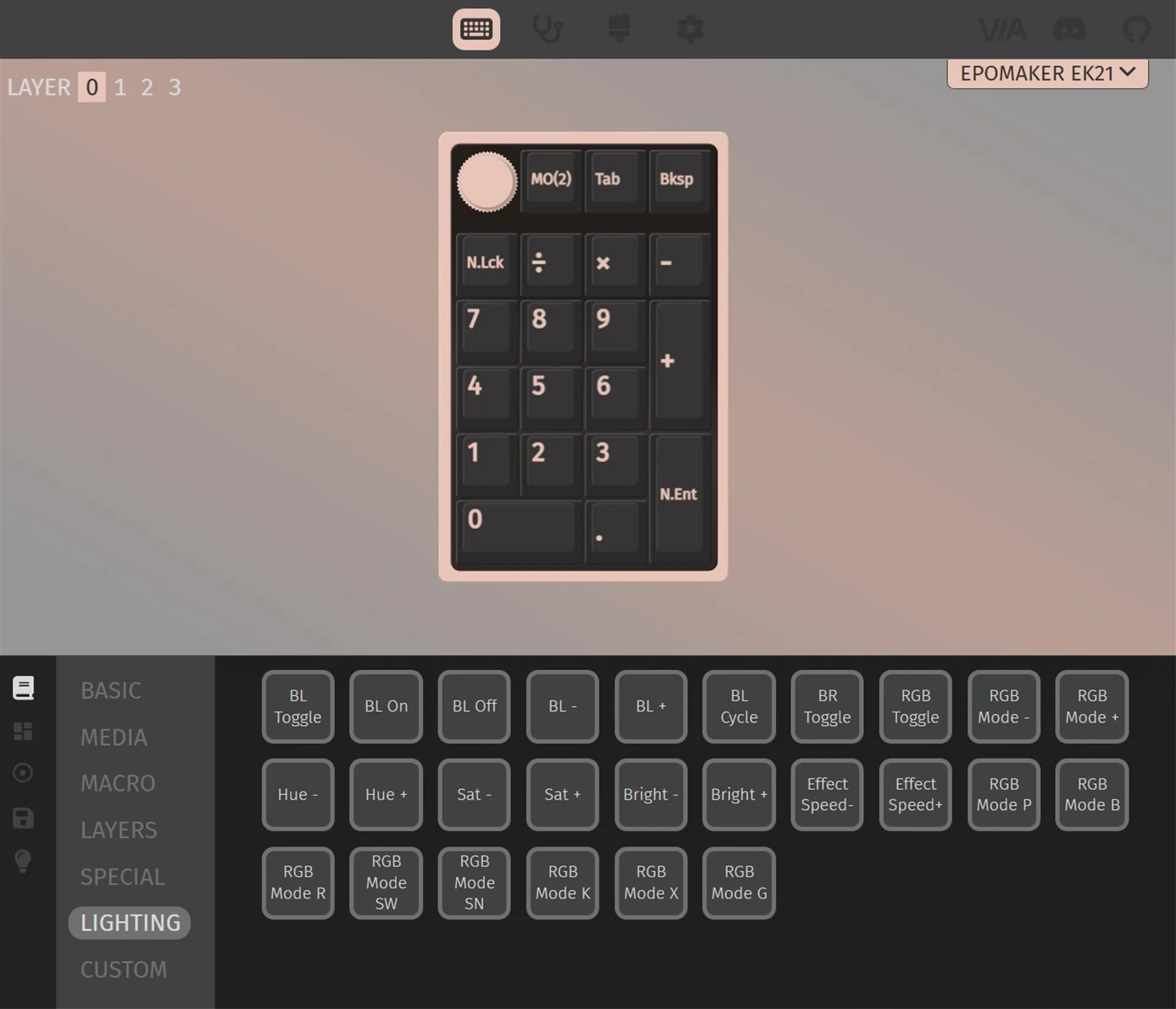 EPOMAKER EK21はテンキーなので、キーが少ないわけですが、キーアサインの変更が容易で、且つFnキーを活用してレイヤー切り替え、他のキーマッピングへ一括変更も可能です。