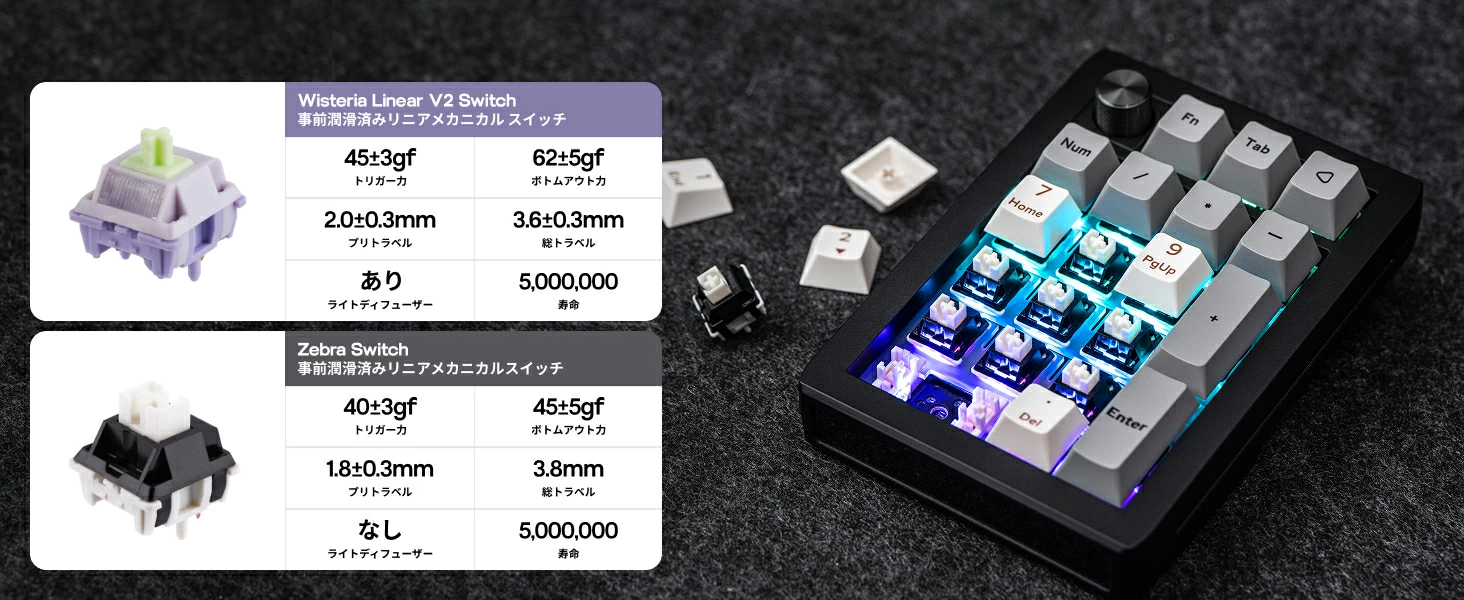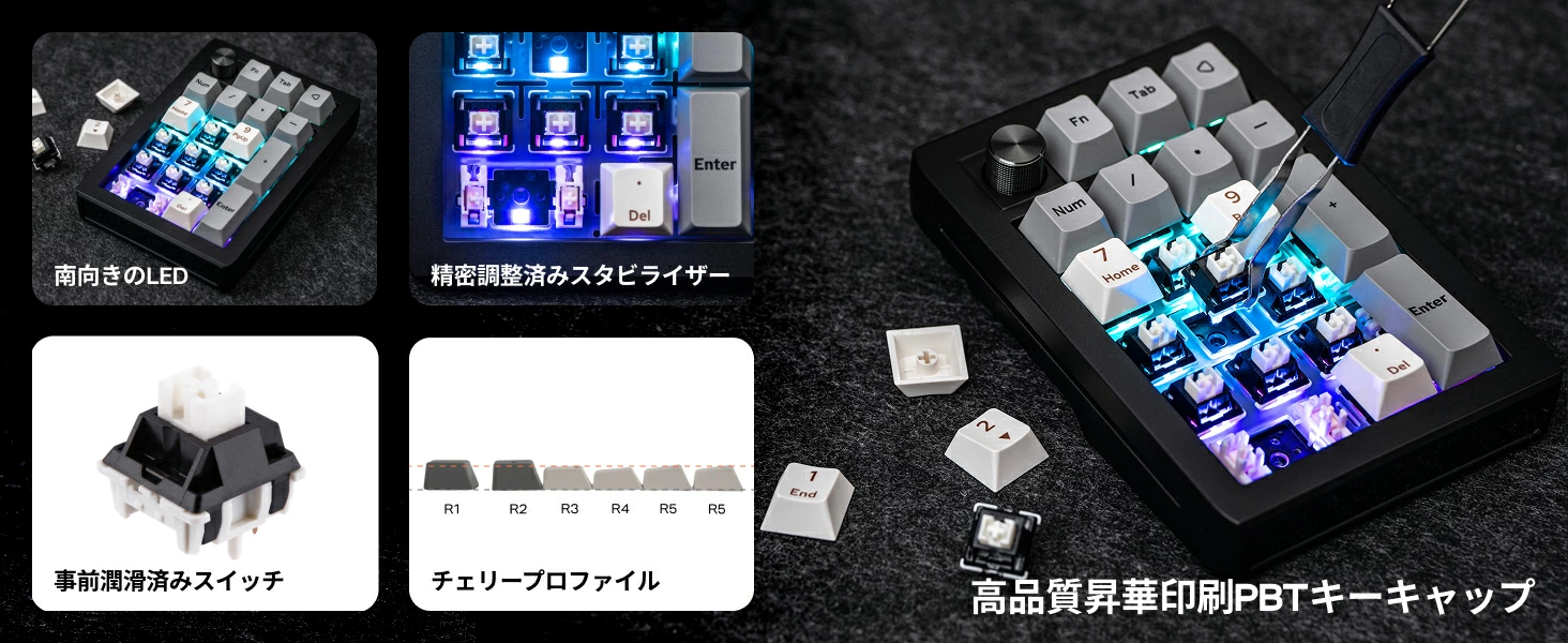 最大の特徴は、ソフトウェアによる全キープログラマブル機能。数字入力だけでなく、マクロやショートカットキーを割り当て、作業効率をさらに高めることが可能です。ホットスワップにも対応しており、好みのキースイッチに簡単に交換できます。回転ノブも搭載し、音量調整などを直感的に操作可能。カスタマイズ可能なRGBバックライトも備え、機能性とデザイン性を両立した、デスク環境をアップグレードする一台です。