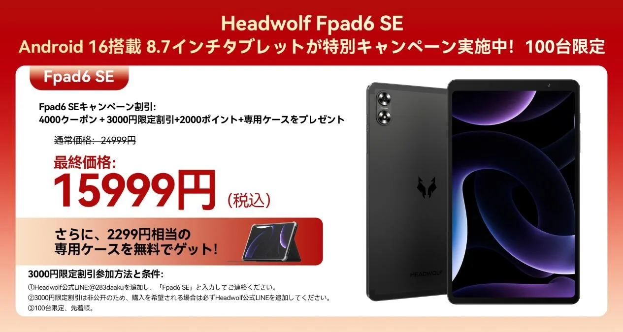 タブレットメーカーのHEADWOLFから発売された、8.7インチと小型なタブレット「HEADWOLF F6E(FPad6 SE)」が、一気に7000円オフ+2000ポイント還元のシークレットクーポンキャンペーンがスタートしました。