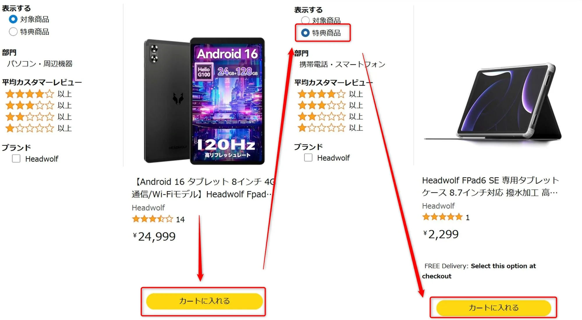 続いて「特典商品」をタッチ(クリック)すると専用ケースが表示されるので、そちらもカートに入れ、双方を1オーダーで注文するとケースが無料となります。