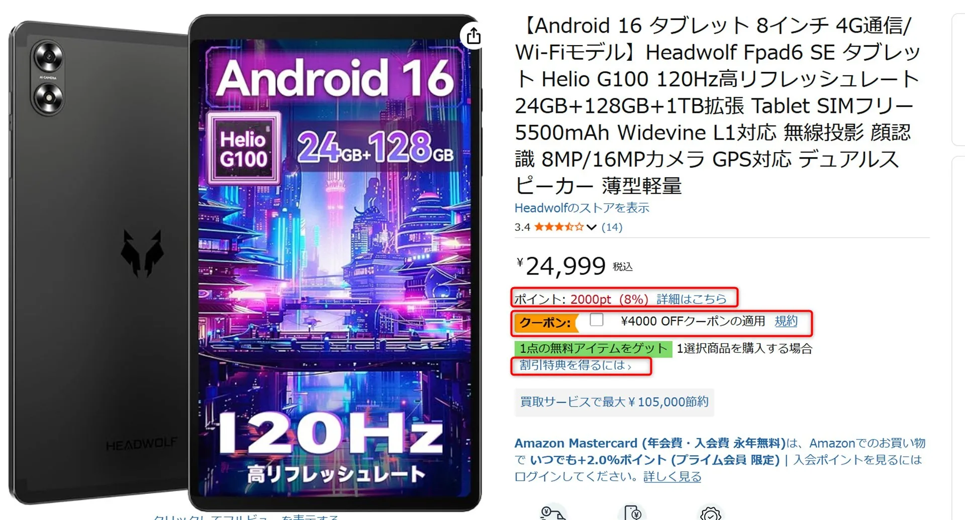 これで7000円オフで17,999円で購入可能。更に2000円分のポイント還元で、実質15,999円です。