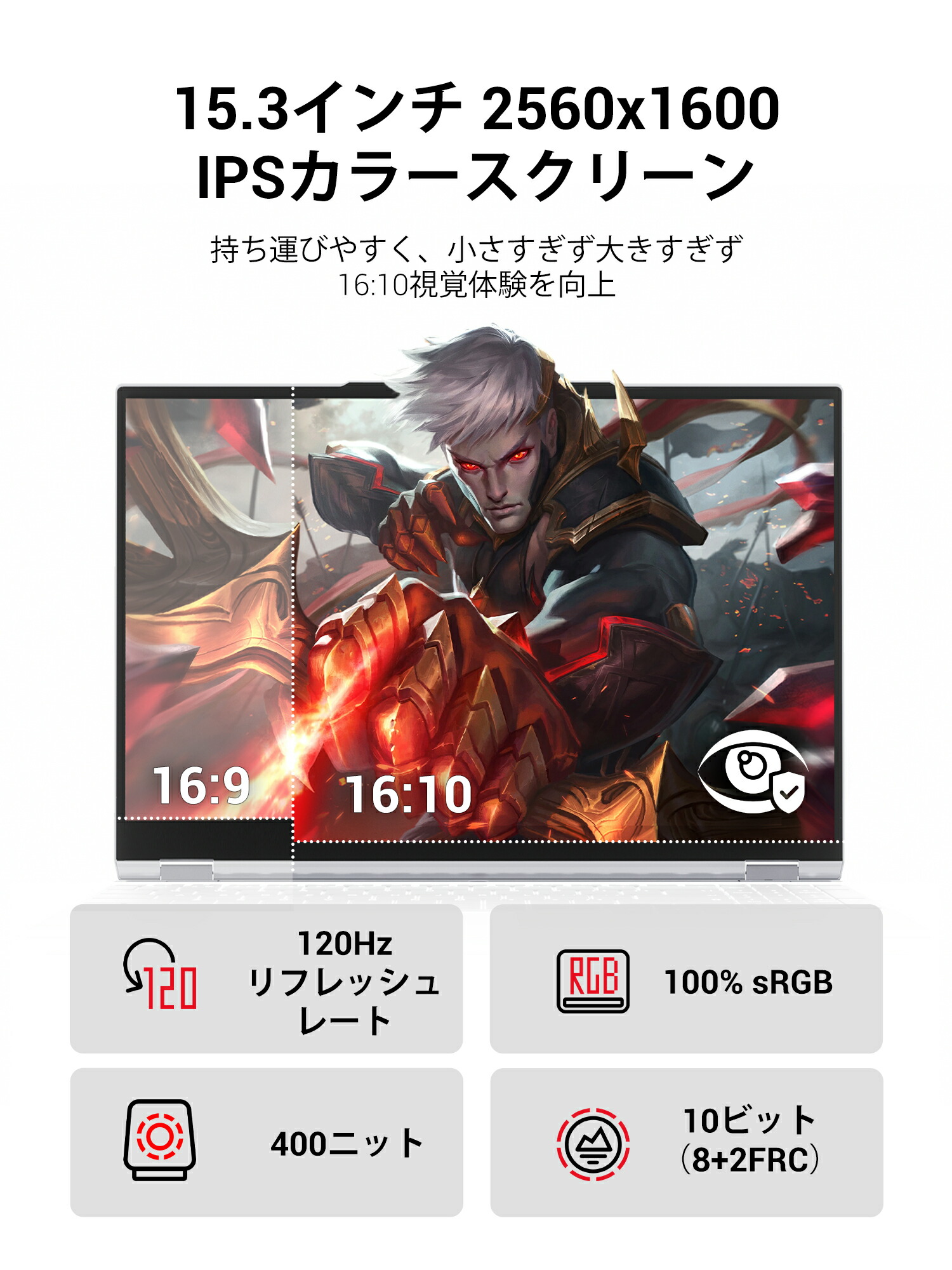 | ディスプレイ | 15.3インチ IPS液晶解像度: 2.5K (2560 x 1600) アスペクト比: 16:10 リフレッシュレート 120Hz |