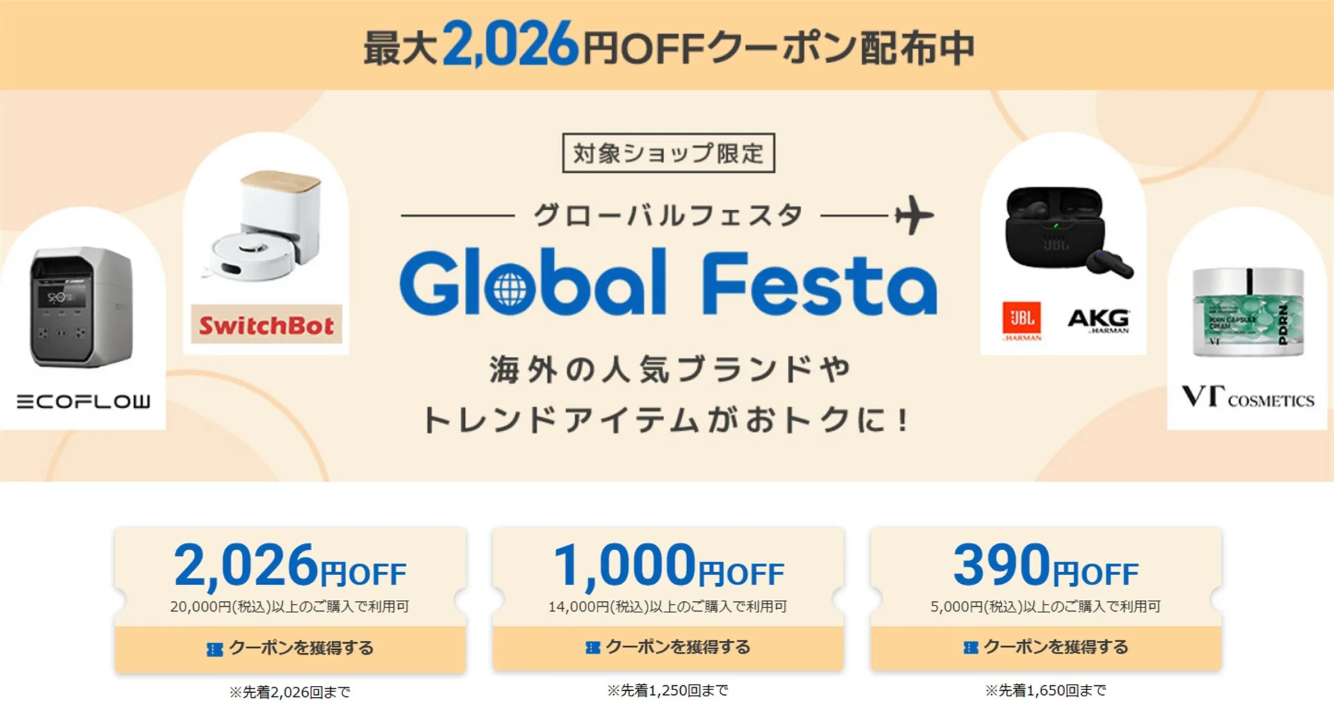 現在、楽天市場では2,026円オフ限定クーポンが配布されており、これら各モデルの専用クーポンと併用が可能です。