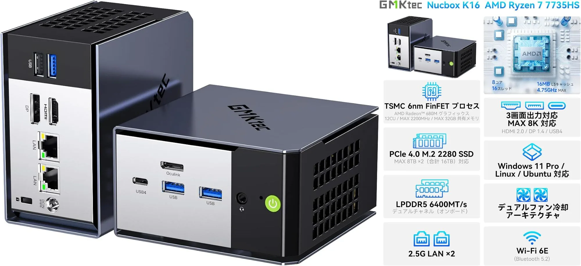 Ryzen7 7735HSはパワフルで、重い作業も楽々。このK16もOCulink&USB4搭載だから、後から外付けグラボを追加してゴリゴリのゲーミングPCにもできるミニPCです。