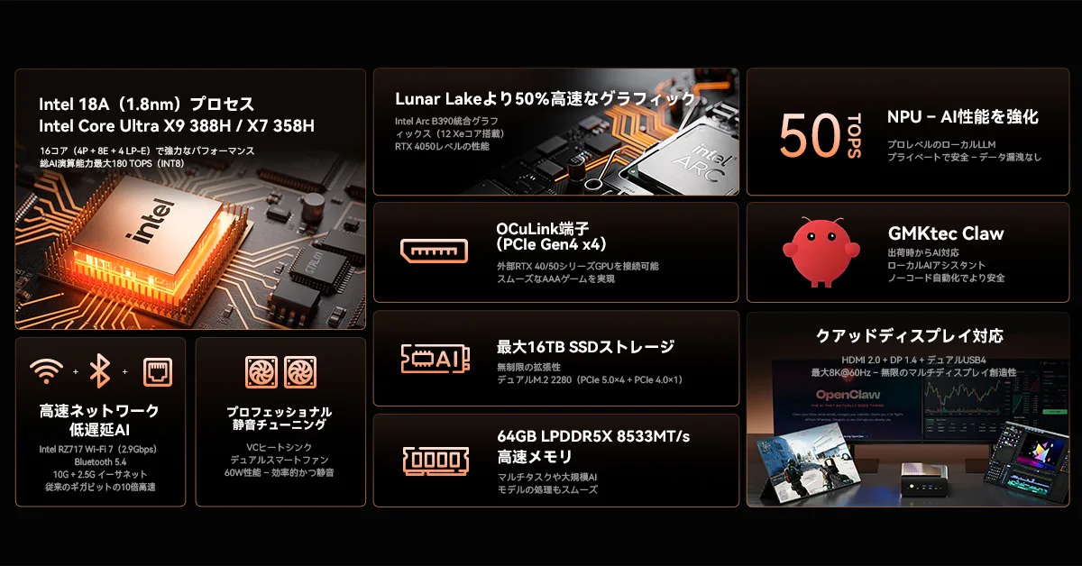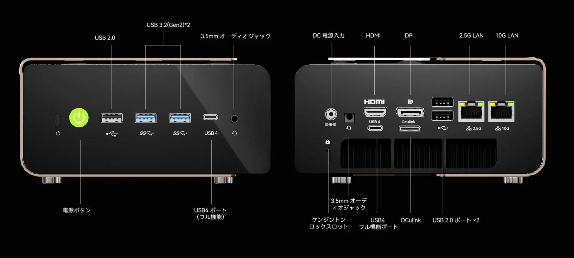 | 拡張ポート | フロントI/O • 1× USB4 Type-C (PD 3.0, 最大100W入力 / DP 4K@60Hz / 40Gbps) • 2× USB 3.2 Gen2 Type-A (10Gbps) • 1× USB 2.0 Type-A (480Mbps) • 1× 3.5mm オーディオコンボジャックリアI/O • 1× USB4 Type-C (PD 3.0, 最大100W入力 / DP 4K@60Hz / 40Gbps) • 2× USB 2.0 Type-A • 1× HDMI 2.1 TMDS (4K@60Hz) • 1× DP 1.4 (8K@60Hz, DP++) • 1× OCuLink (PCIe 4.0 ×4、ホットスワップ非対応) • 1× 10G RJ45 LAN • 1× 2.5G RJ45 LAN • 1× DC IN (5.5 × 2.5mm) • 1× ケンジントンロックスロット |