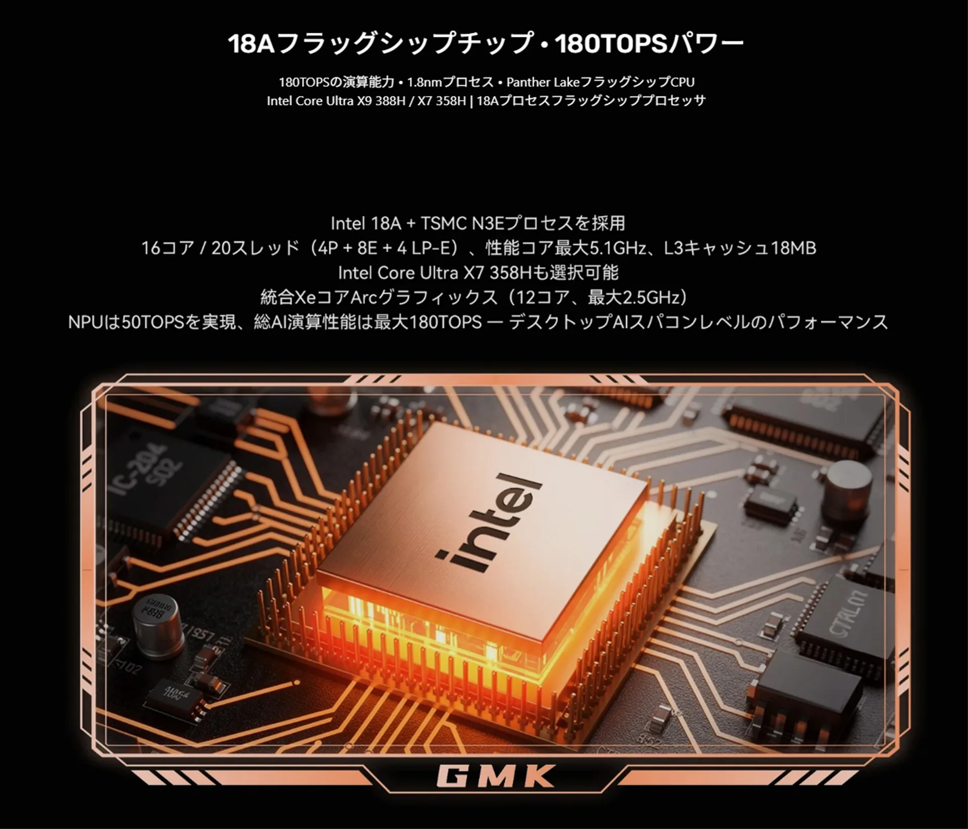 このプロセッサは、NPUやGPUなどを合わせた合計のAI演算性能が180 TOPSに達し、ChatGPTのような大規模言語モデル(LLM)の推論をクラウドではなく、自分のPC内(ローカル)で実行できます。
