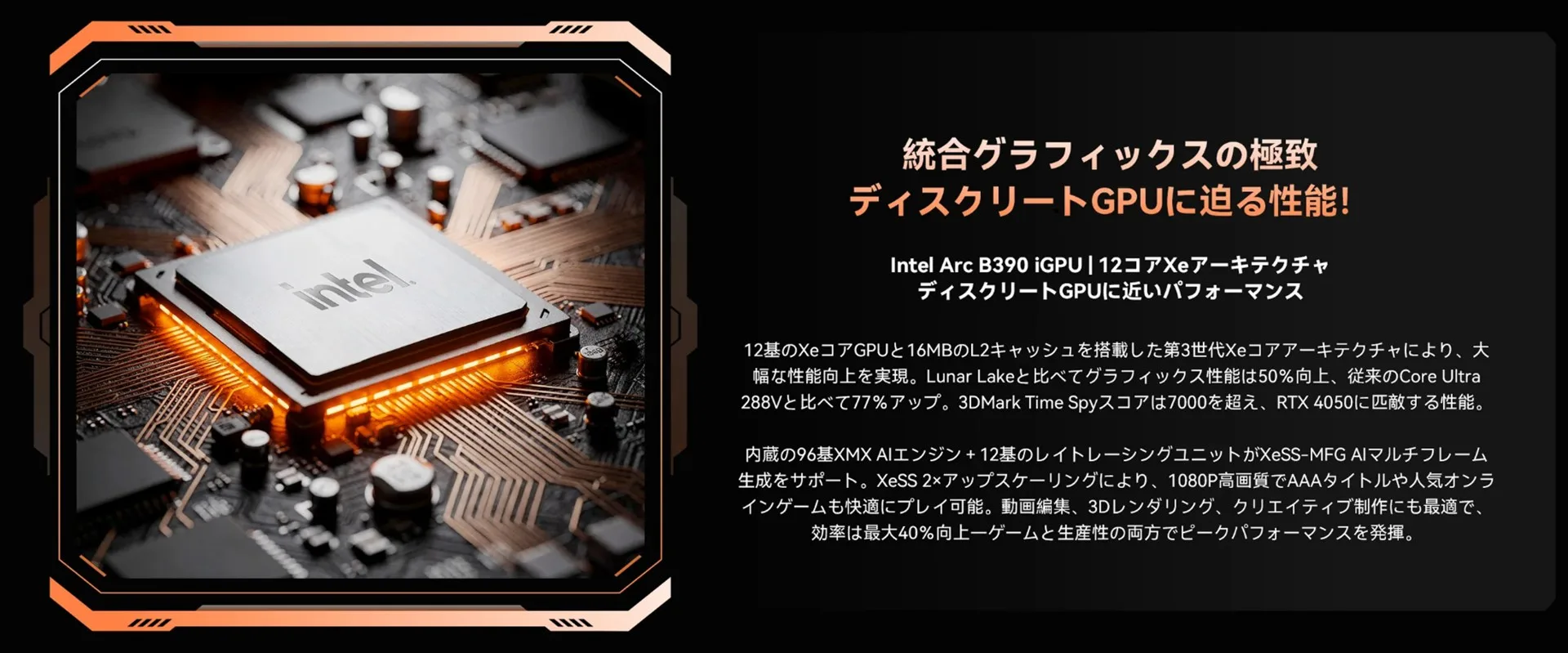 GPUにはIntel Arc B390統合グラフィックスを搭載。ただその性能はノートPC向けの単体GPUであるGeForce RTX 4050クラスに相当します。