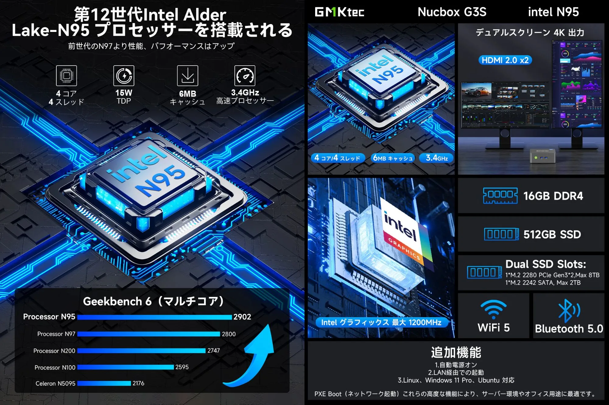 このN95はGeekbench 6 マルチコアスコアが、 約2,900点〜3,200点程度で、数字上は上となるIntel N100と性能も低消費電力も同等の性能です。私はN100のミニPCをリビング用に使っていますが、ブラウザ、動画視聴、簡単な資料作成程度は余裕です。