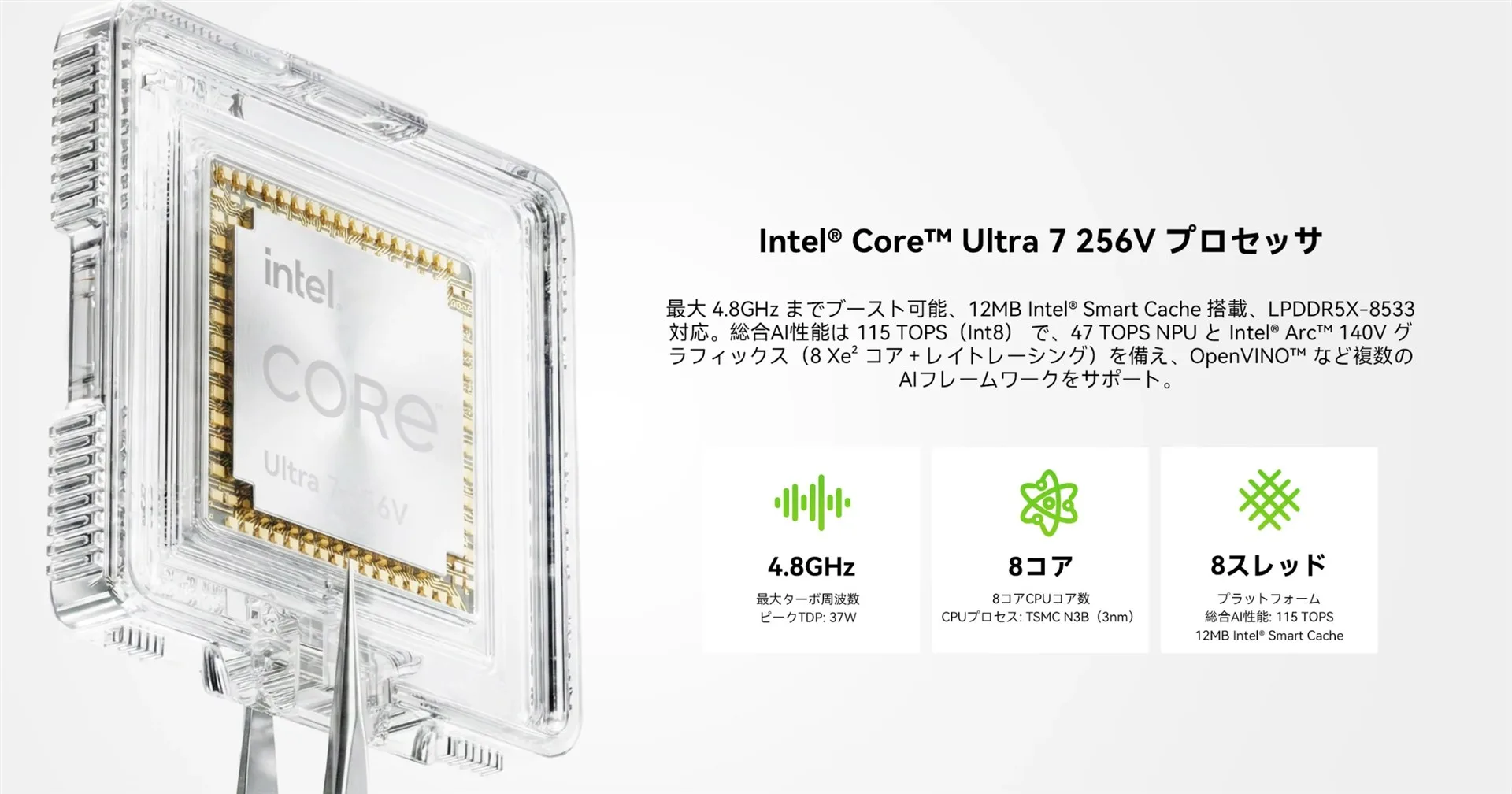 プロセッサには、Intelの最新アーキテクチャ「Lunar Lake」を採用した Intel Core Ultra 7 256V を搭載。