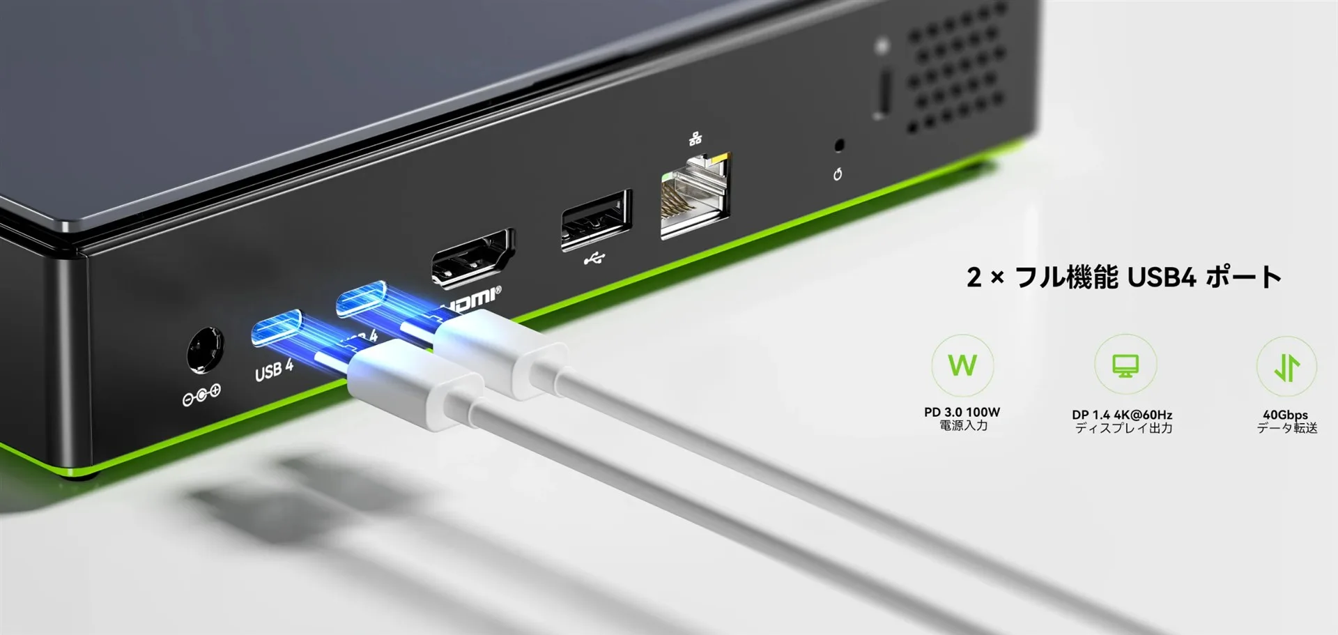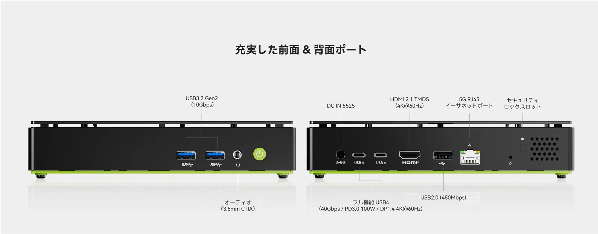 | 入出力ポート | 【前面】 1 x USB4 (Type-C / 40Gbps / PD給電 / 映像出力) 2 x USB 3.2 Gen2 (Type-A) 1 x 3.5mm オーディオジャック 1 x 電源ボタン 【背面】1 x USB 3.2 Gen2 (Type-A) 1 x USB 2.0 (Type-A) 1 x HDMI 2.1 1 x DisplayPort 1.4 2 x 2.5G LAN (RJ45) 1 x DC-IN電源ポート |