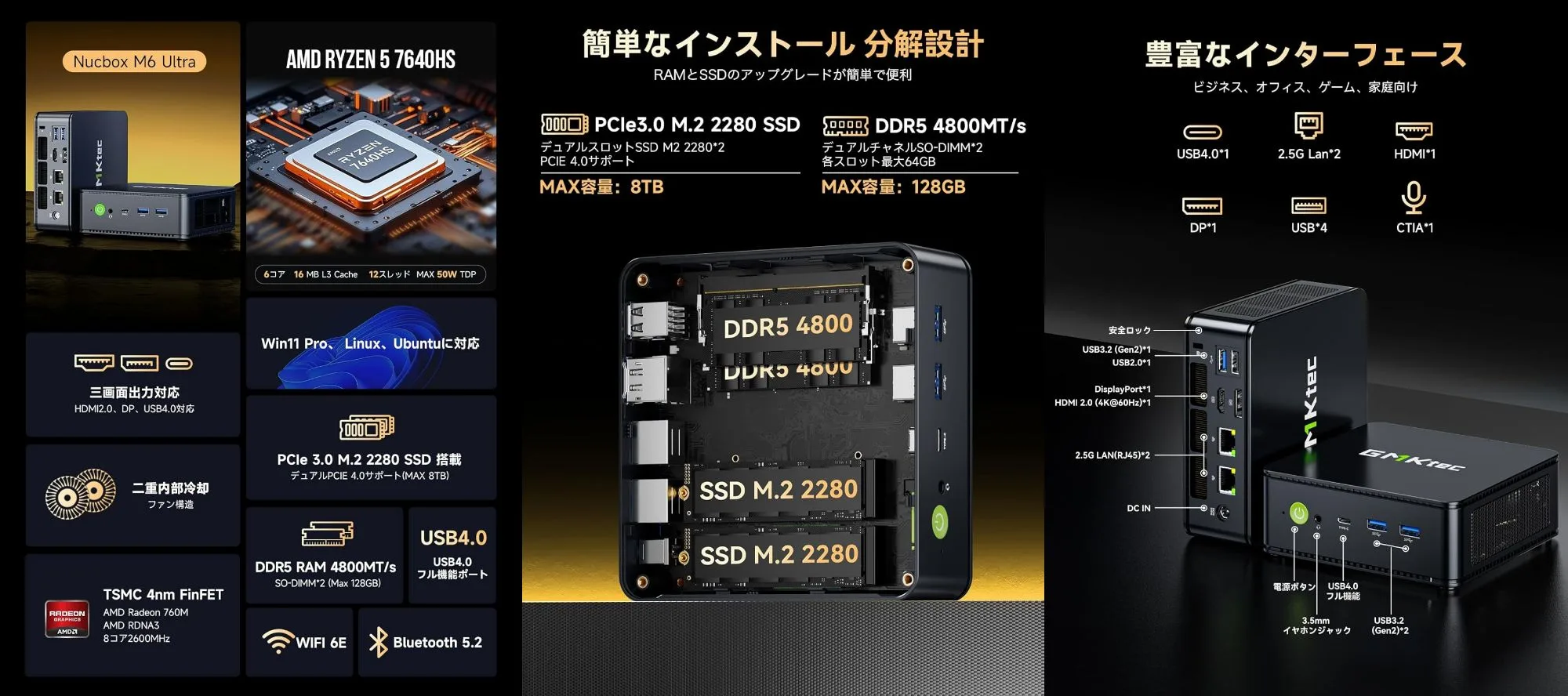 「M6 Ultra」シリーズは、GMKtecのラインナップの中でもRyzen 5 7640HSを搭載した、パフォーマンスを重視した上位モデルです。