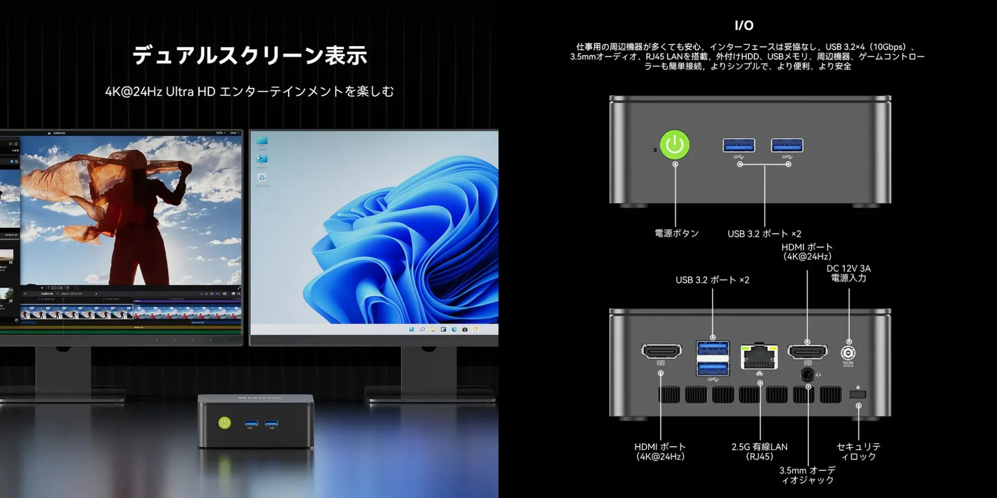 | インターフェース | 【前面】 ・USB 3.2 Gen1 (Type-A) × 2 ・電源ボタン 【背面】 ・USB 3.2 Gen1 (Type-A) × 2 ・HDMI 2.0 (4K@60Hz) × 2 ・RJ45 (2.5G LAN) × 1 ・3.5mm オーディオジャック × 1 ・DC電源ポート × 1 |
