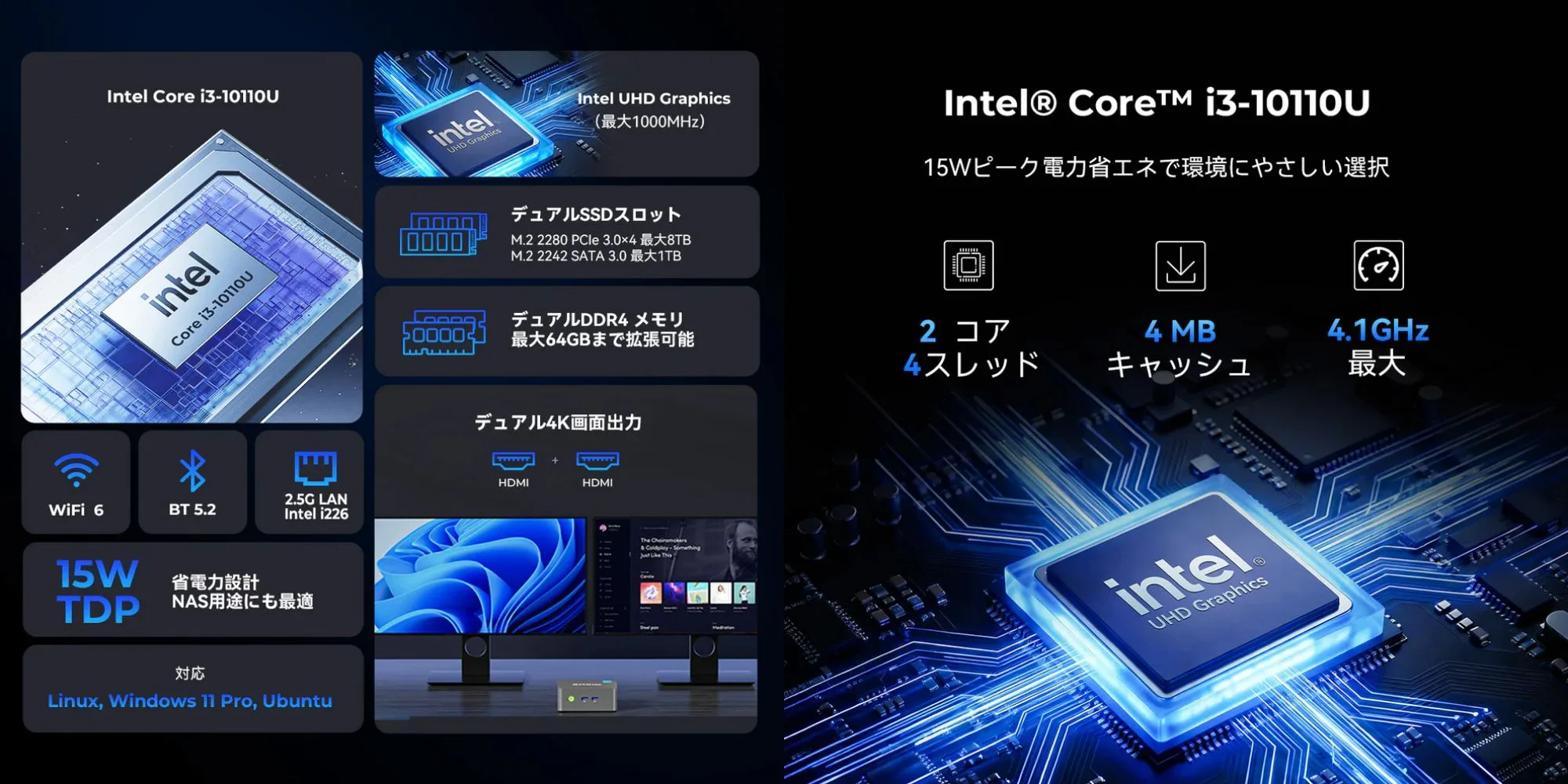 NucBox G3 Proには2コア4スレッド、最大周波数4.1GHzで動作する Intel Core i3-10110U プロセッサが搭載されています。