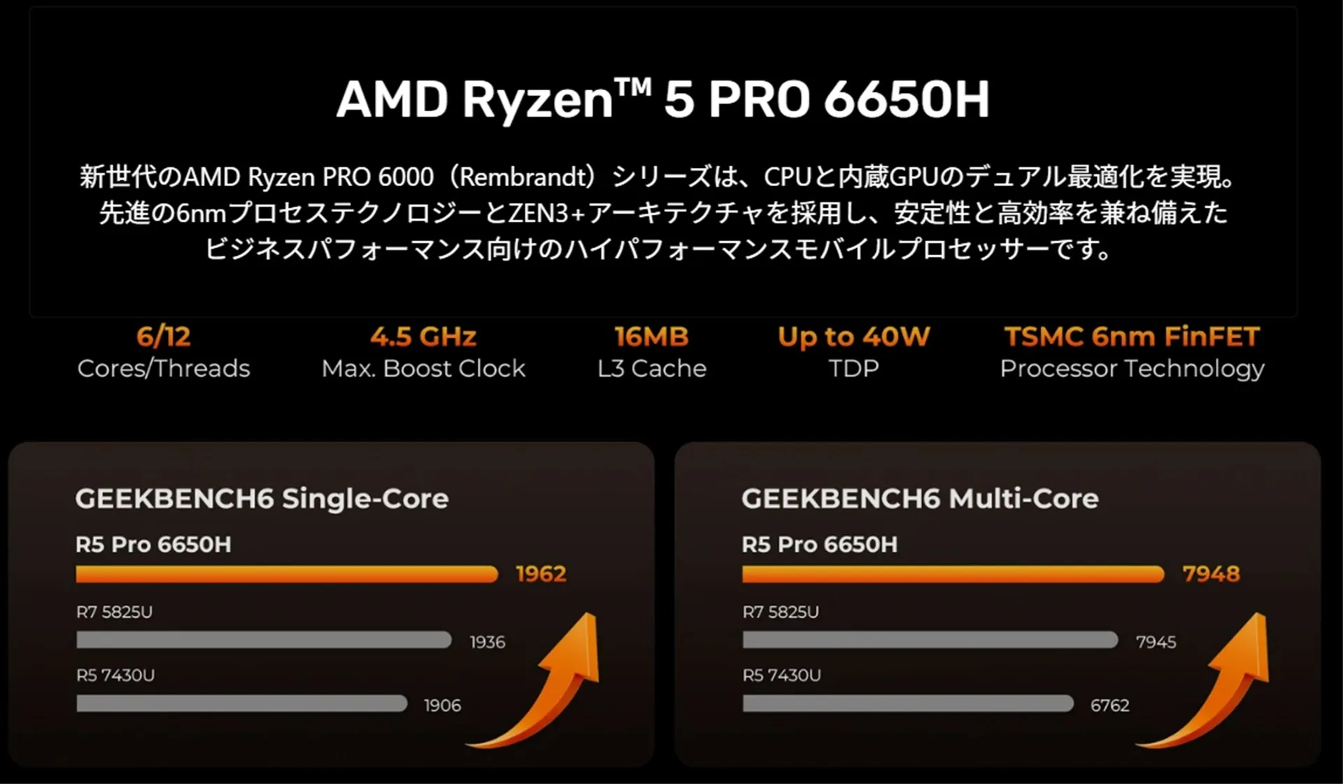 AMD Ryzen 5 PRO 6650H (6コア / 12スレッド, 最大 4.5GHz)