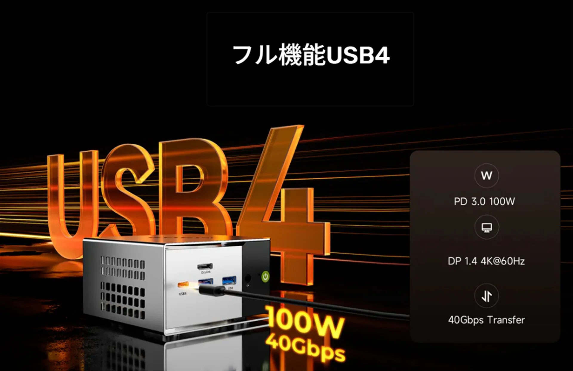 このモデル最大の特徴は、外付けGPU(eGPU)などを高速に接続できる「OCuLink」ポートと「USB4」を搭載している点です。グラフィック性能を拡張したい場合、このどちらかのポートで外部GPUにアクセス出来るため、ゲーミング用途にしたい場合には、大きなメリットです。