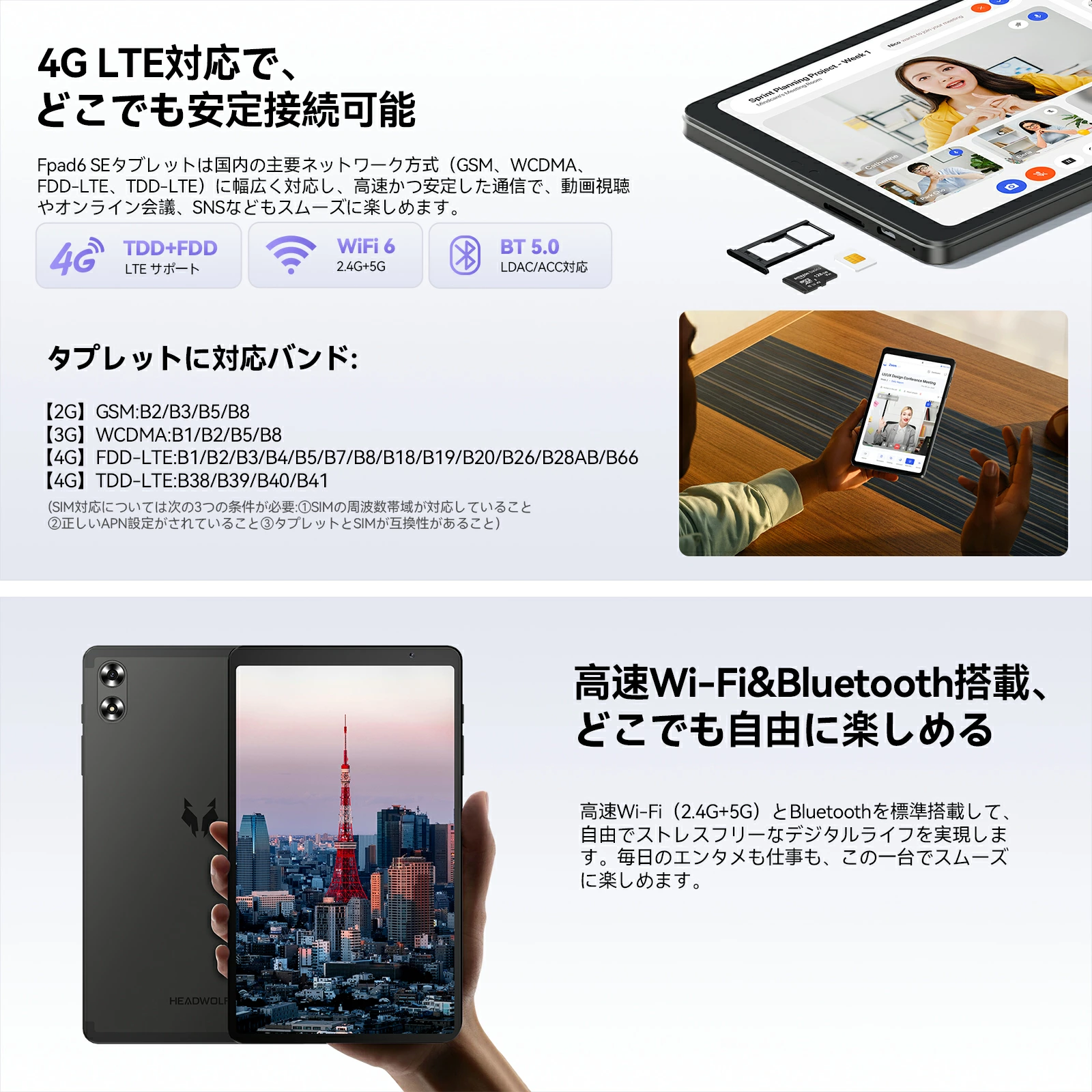 4G LTE: デュアルSIM対応で、外出先でも単体通信が可能です。FPad6 SEは対応バンドが広く、日本の主要キャリアのプラチナバンドを網羅しています。