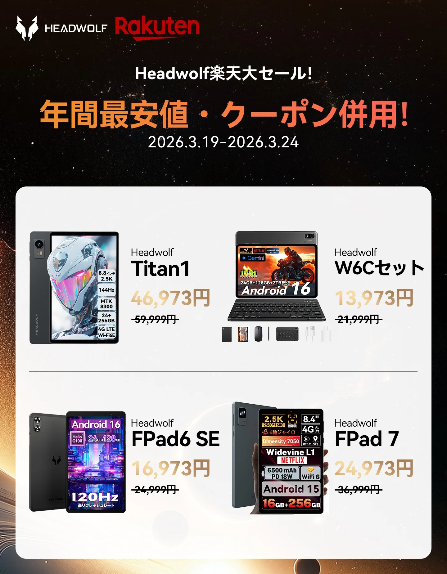 楽天市場にてHEADWOLFの人気タブレットに使える特別追加クーポンが配布中です。それに合わせてHEADWOLFでもセール/クーポン価格で割引となっており、そのクーポンより2,026円オフが適用されるため、以前よりも安くてに入ります。