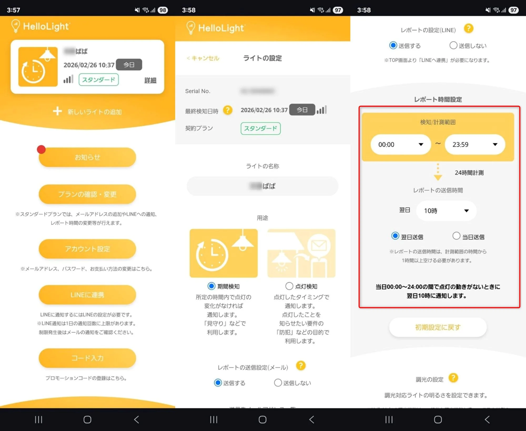 設定として、期間検知か点灯検知かが選べ、レポートの送信の有無、それと重要なのが検知範囲の設定です。