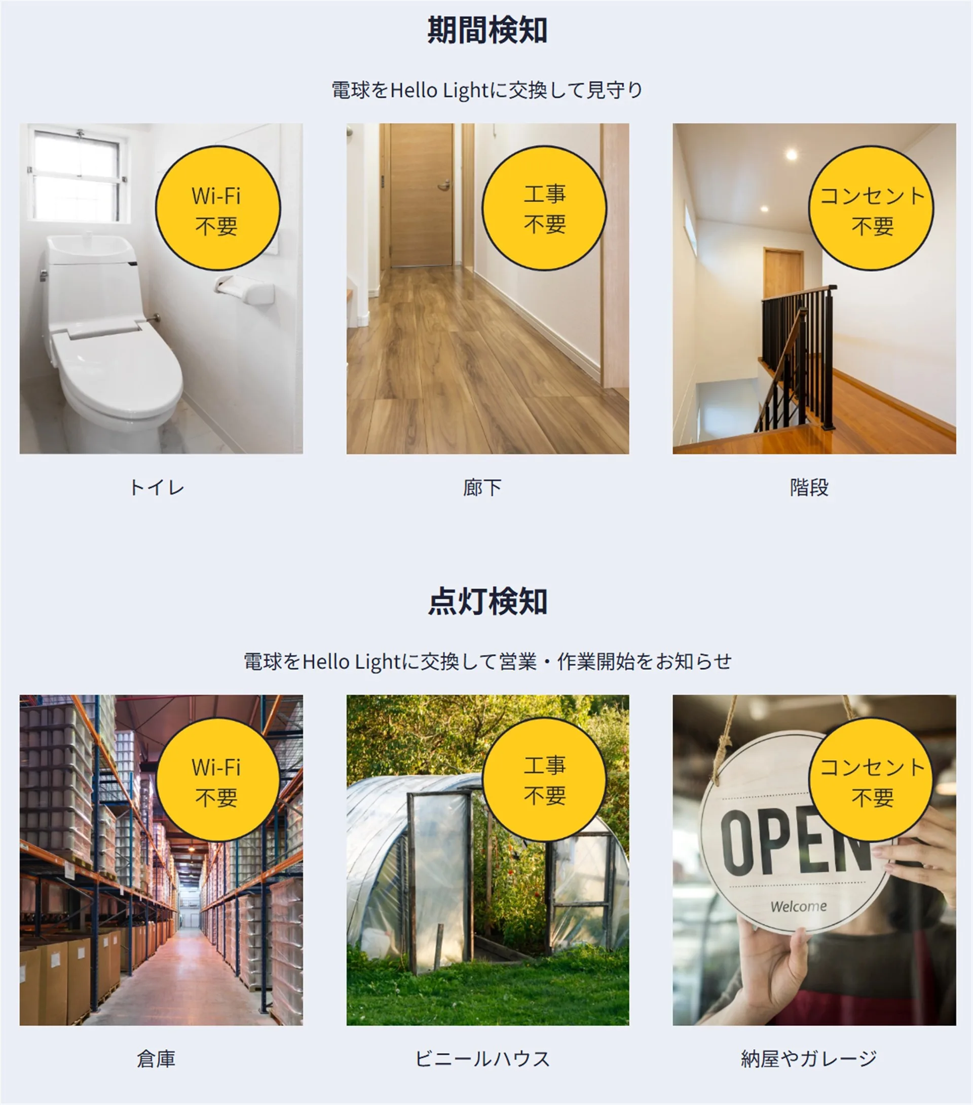 また、電球が点いた瞬間に通知する「点灯検知」は、空き家の防犯や倉庫の業務確認などに役立ちます。