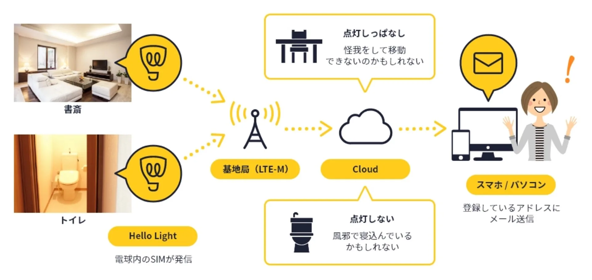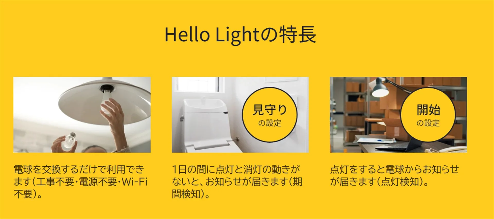 これであれば、IoTカメラで監視するというような事をする必要がないのでストレス無しですし、プライバシーを守れます。電球を付け替えるだけで手軽に日常の状況を把握できるようになっています。