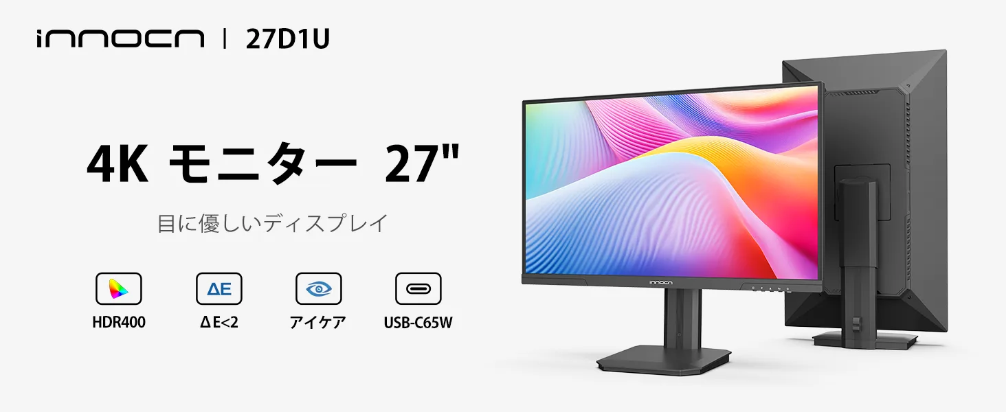 INNOCN 27D1Uは、4K解像度且つDisplayHDR 400に対応した27インチモニターです。