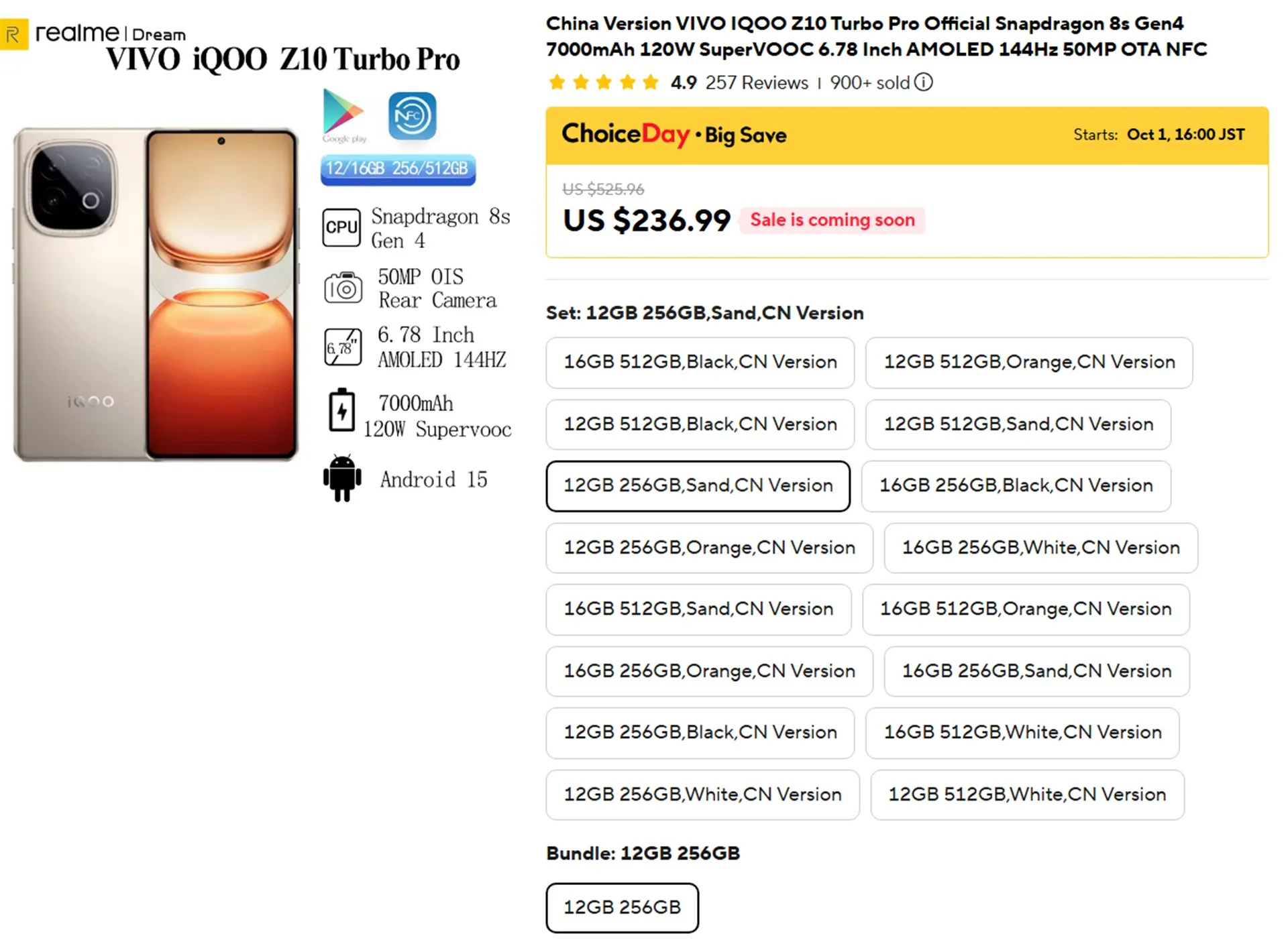iQOO Z10 Turbo Proは12GB+256GB版は236.99ドルでセール中。