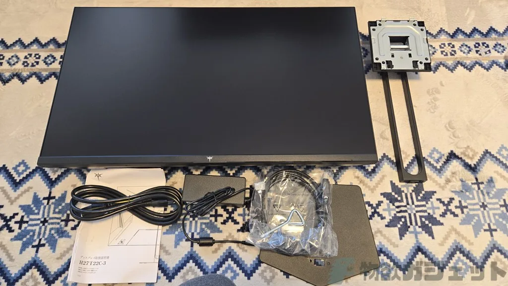 同梱は、ディスプレイ本体、スタンド、ACアダプタ、マニュアル、HDMIケーブルです。