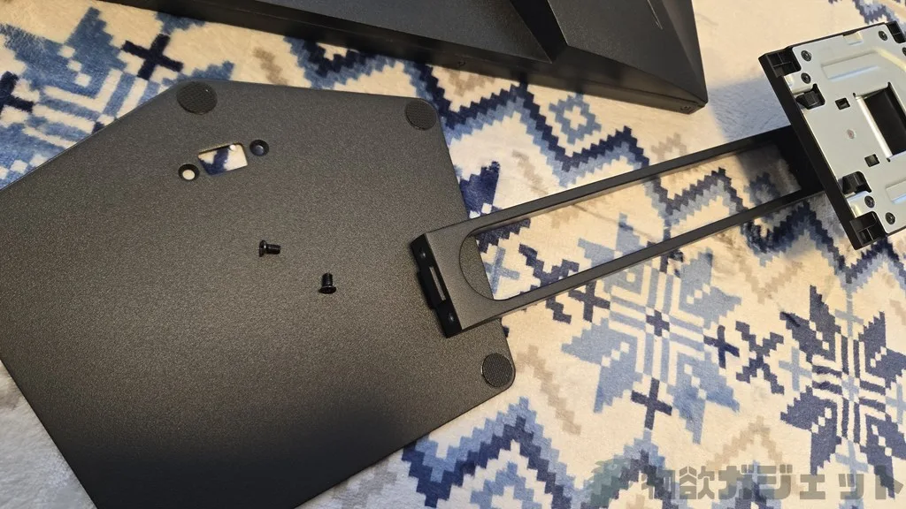 スタンドはネジで固定するタイプ。面倒だけども初回だけですし、価格も安いし仕方ない。
