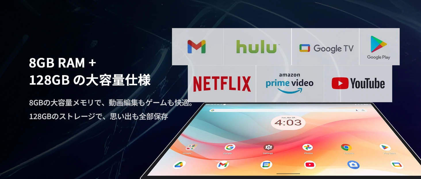 そして8GBのメモリと128GBのストレージを備えているため、動画視聴がメインの専用機としては必要十分。