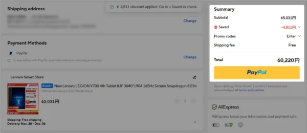 Lenovo LEGION Y700 Gen4 12GB+256GB版は、405.48ドル(約6万5000円)でAliExpressでセール中。