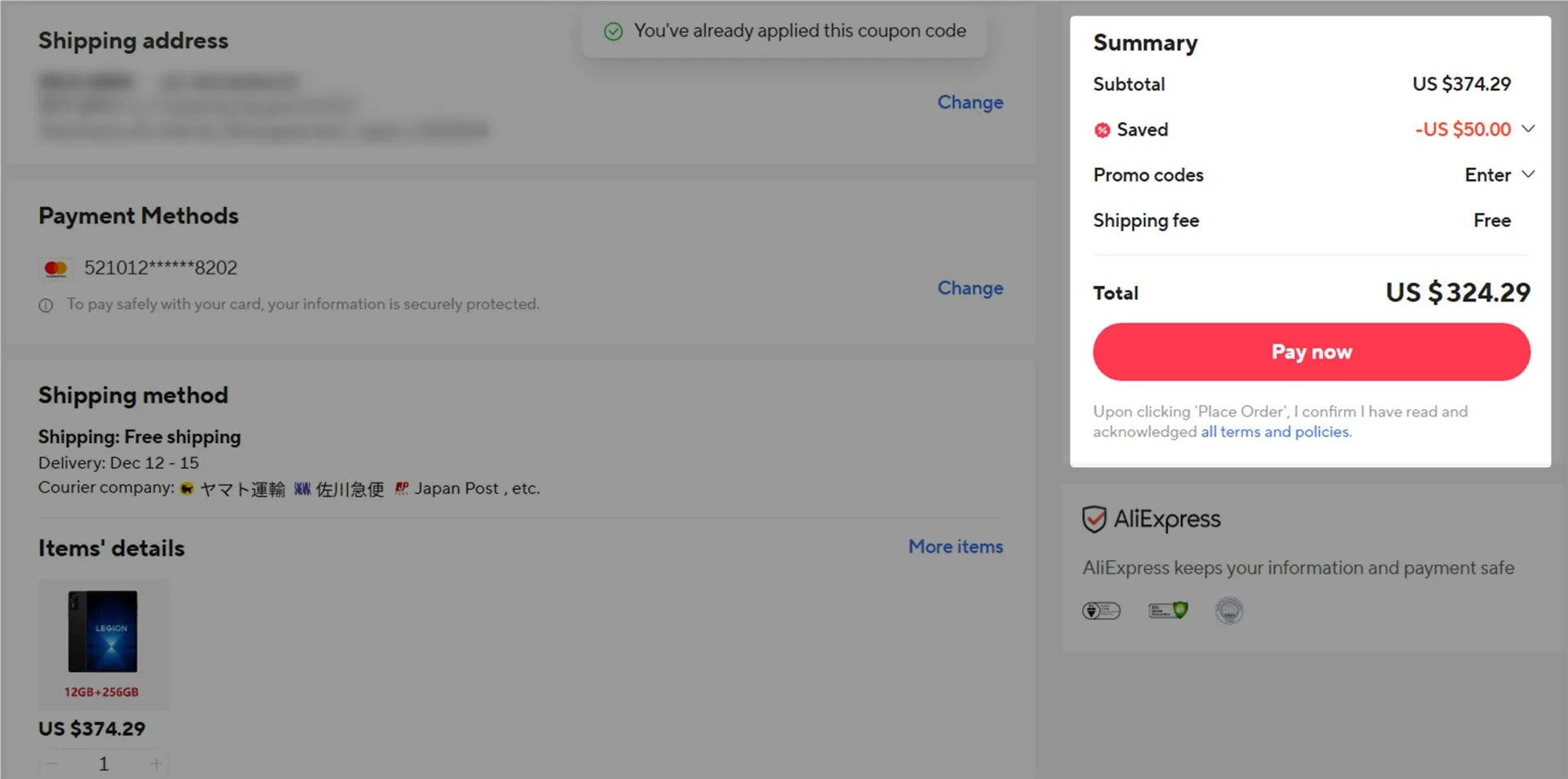 更に、以下50ドルオフクーポンが使える為、最終値引き後価格は324.29ドルです。日本円でだいたい51,000円。