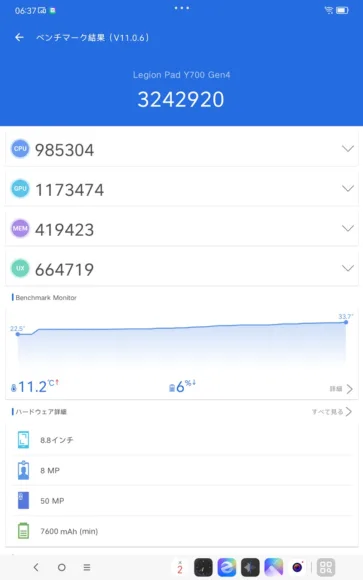 先日Y700 Gen4が届いたのでAnTuTu v11ベンチマークしてみましたが320万点と爆速。